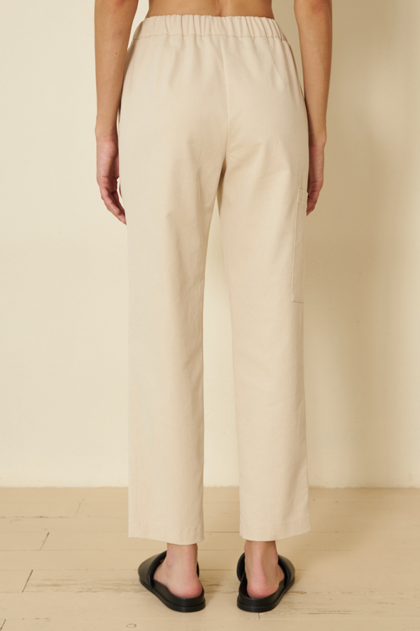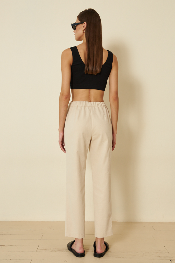 Брюки из хлопковой ткани, зауженные книзу. В боковых швах выполнены карманы с подкройным бочком. Пояс с эластичной резиной. На передней части брюк имитация гульфика, на бедре- карман.