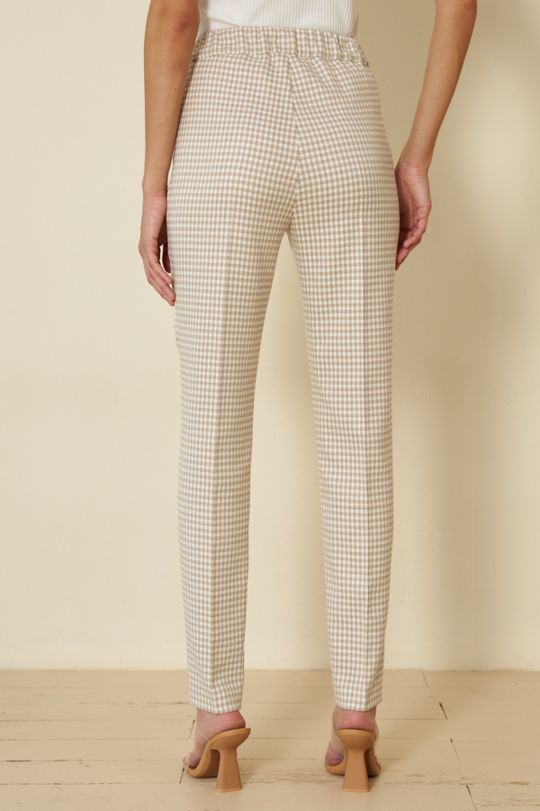 Брюки прямого силуэта, зауженные книзу из костюмной ткани. На передней части брюк застрочены стрелки. Пояс притачной с эластичной резиной.