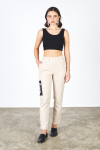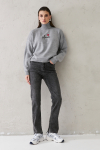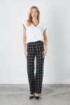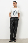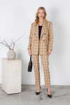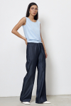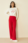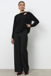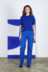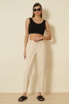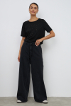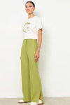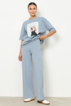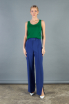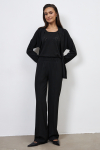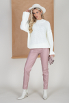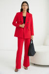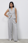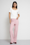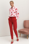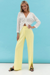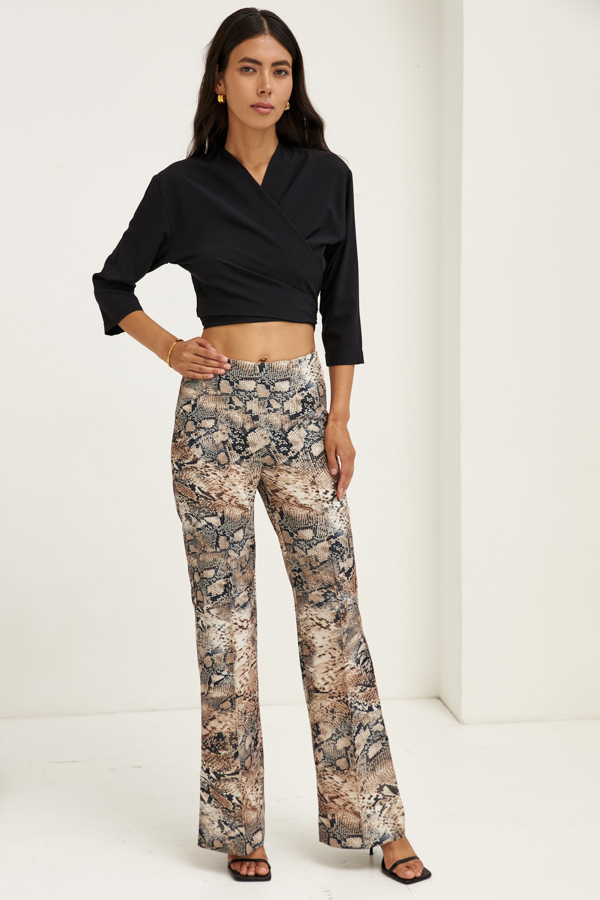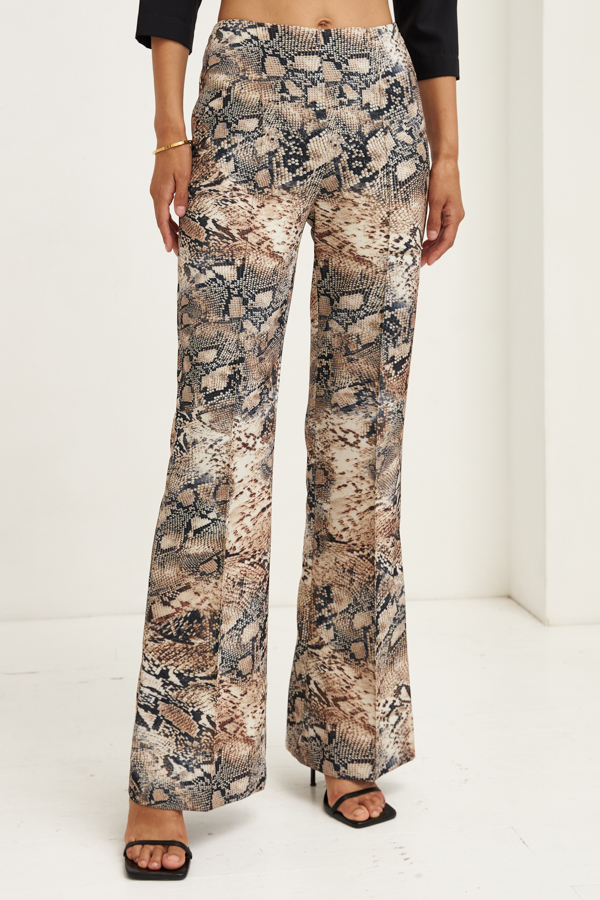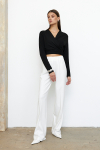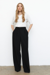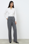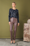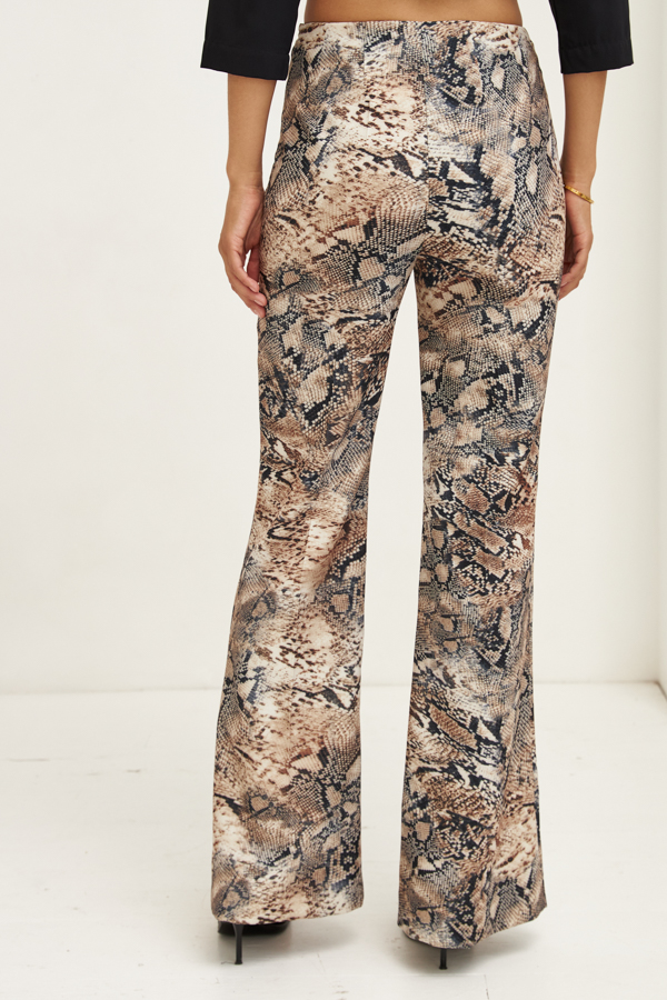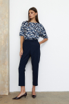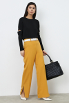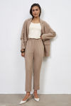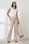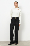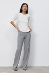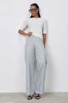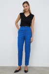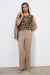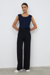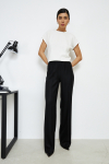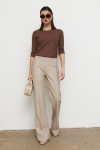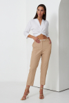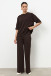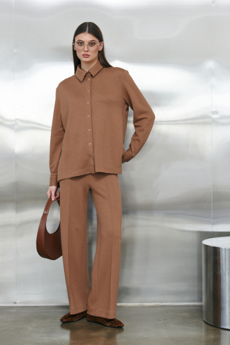 Брюки, зауженные в области колена и расклешённые книзу из костюмной ткани. На задней части брюк по талии выполнены две вытачки. На передней части застрочены стрелки. Брюки без пояса на обтачке. В боковом шве потайная молния. Низ брюк оформлен широкой подгибкой.