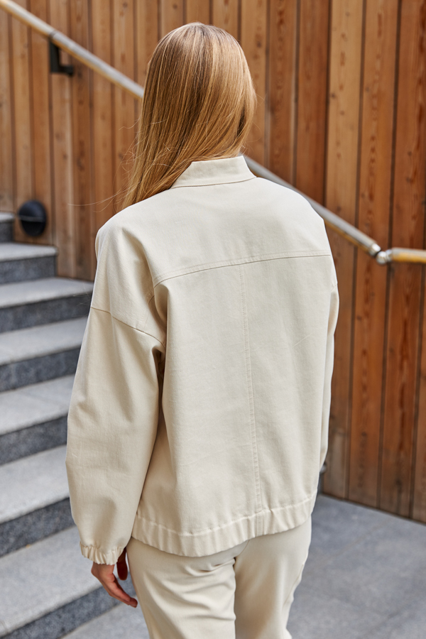 Жакет-бомбер выполнен из хлопковой ткани. Свободный силуэт с застёжкой-молнией и накладными карманами. Рукав втачной в спущенную пройму. Нижняя часть рукава и низ изделия присборены на резинку. Линия горловины оформлена воротником-стойкой.