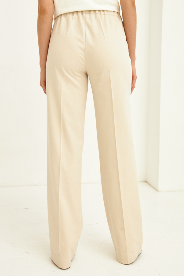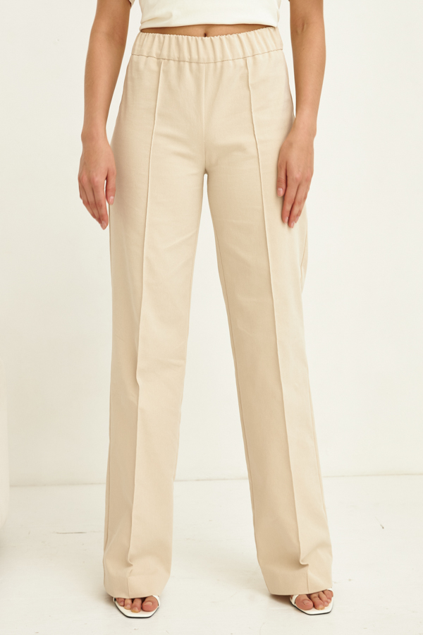 Брюки прямого силуэта из хлопковой ткани. Пояс притачной с эластичной резиной. На передней части брюк застрочены стрелки.
