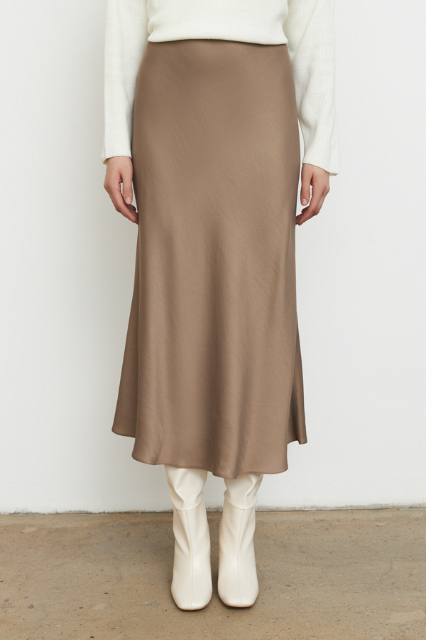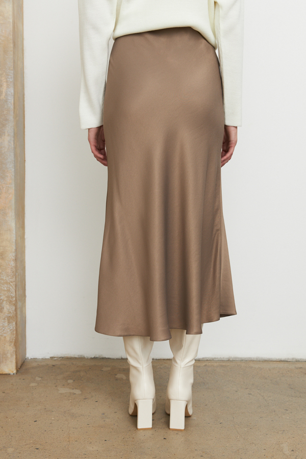 Юбка, слегка расширенная книзу из вискозной ткани с полуматовым сатиновым блеском. Крой юбки по косой, на линии талии скрытая резинка.