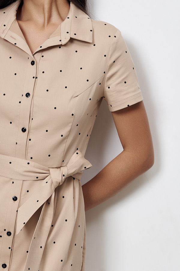 Платье приталенного силуэта из хлопковой плательной ткани. Изделие отрезное по линии талии с защипами. В боковых швах карманы. Втачной короткий рукав. Притачная планка с застёжкой на пуговицы. Вырез горловины обработан отложным воротником на стойке. В комплекте пояс из основной ткани.