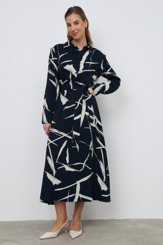 Платье из вискозной ткани. Полуприлегающий силуэт, с разрезом в боковом шве. По среднему шву спинки застёжка на петлю-пуговицу. Круглый вырез горловины и линия проймы окантованы косыми бейками из основной ткани.