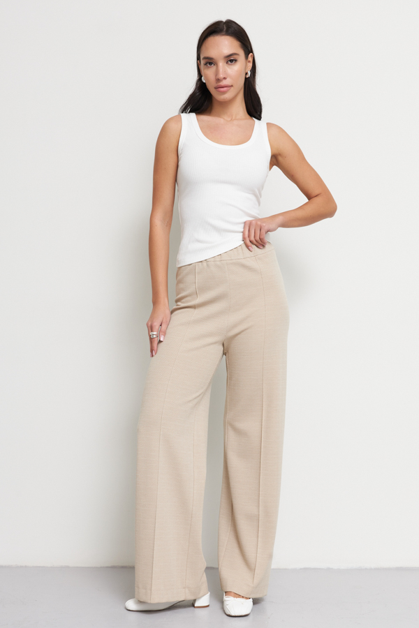 Брюки из эластичного полотна прямого силуэта. Пояс с эластичной резиной. На передней части брюк застрочены стрелки.