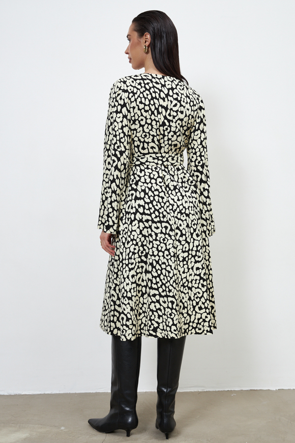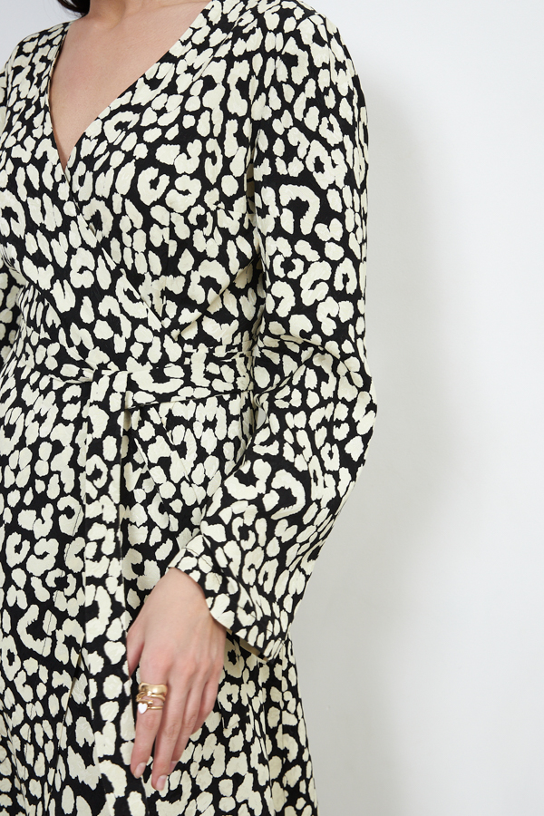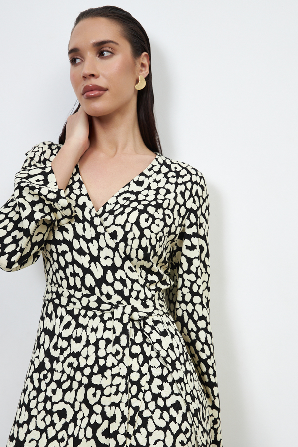 Платье из вискозной ткани отрезное по талии. Изделие с запахом фиксирующимся притачным поясом. Лиф прилегающий, юбка летящего силуэта. Втачной длинный рукав.