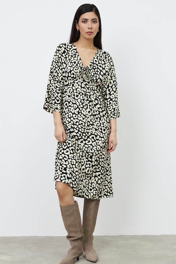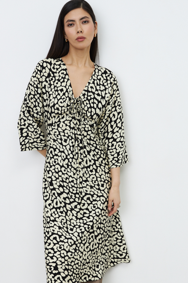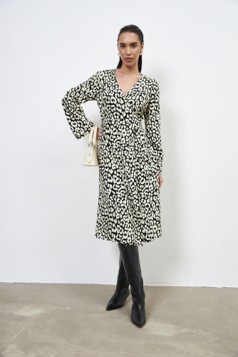 Платье полуприлегающего силуэта из вискозной ткани. Изделие отрезное по линии талии на спинке и чуть выше талии на полочке. V-образный глубокий вырез. Спереди по центру кулиска, в которую продеты два вытачных шнура-завязки. Затянутые завязки образуют драпировку. Длинный цельнокроеный рукав. Юбка скроена по косой. Застежка в левом боковом шве на потайную молнию.