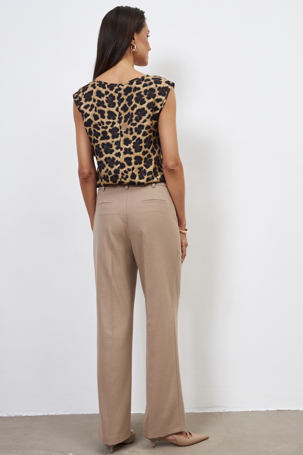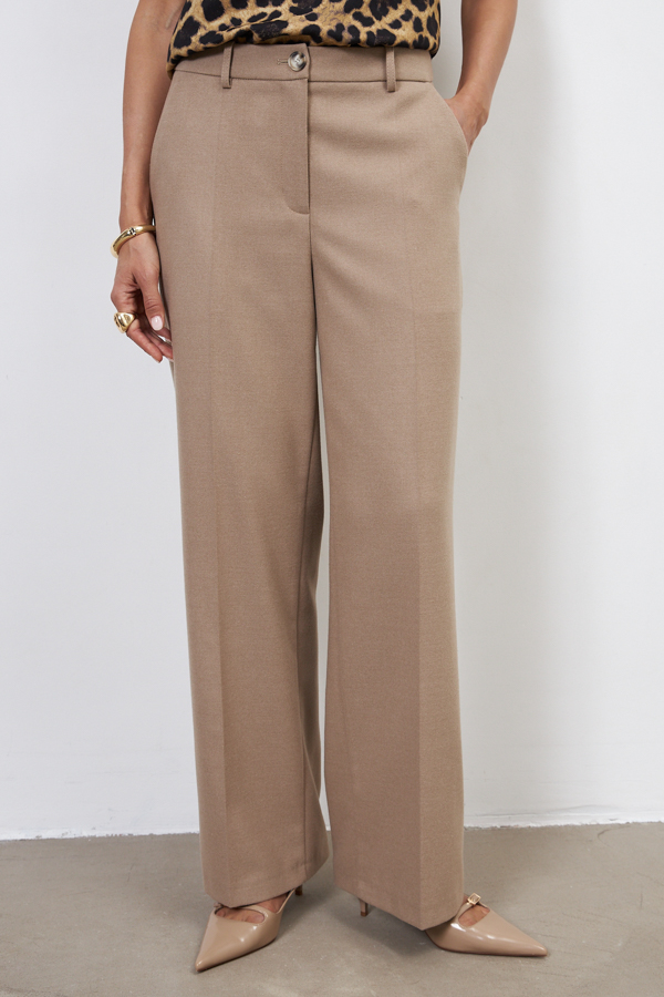 Брюки из костюмной ткани прямого силуэта. На передней половинке изделия выполнены карманы с подкройным бочком, на задней - талиевые вытачки и имитация карманов в рамку. Притачной пояс со шлёвками. Застёжка на молнию-гульфик и пуговицу. Такой крой выгодно подчеркнёт длину ваших ног.