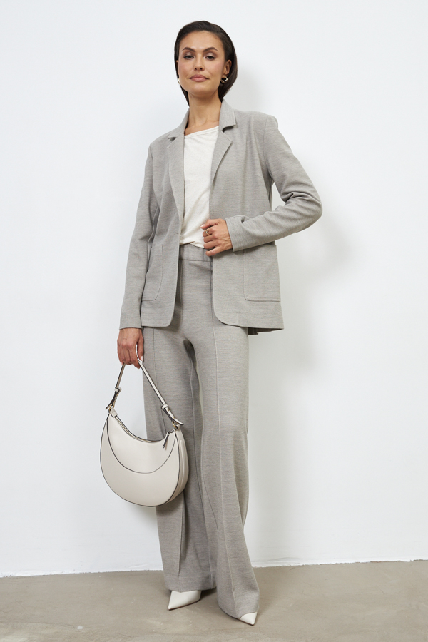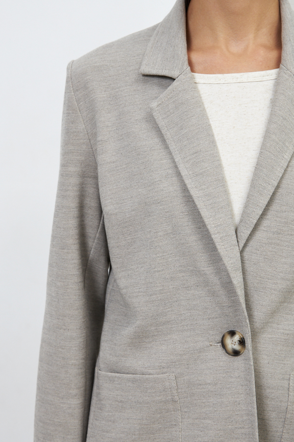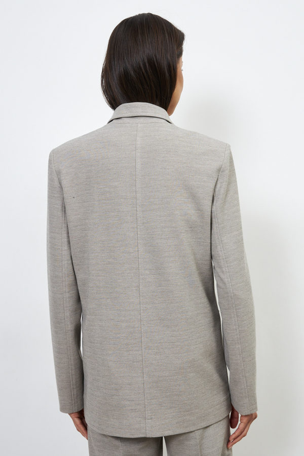 Жакет выполнен из эластичного полотна. Изделие прямого силуэта с английским воротником, который визуально сделает фигуру стройнее и подчеркнет красивую линию груди. На передней части жакета застежка на пуговицу и накладные карманы. Втачной длинный рукав.