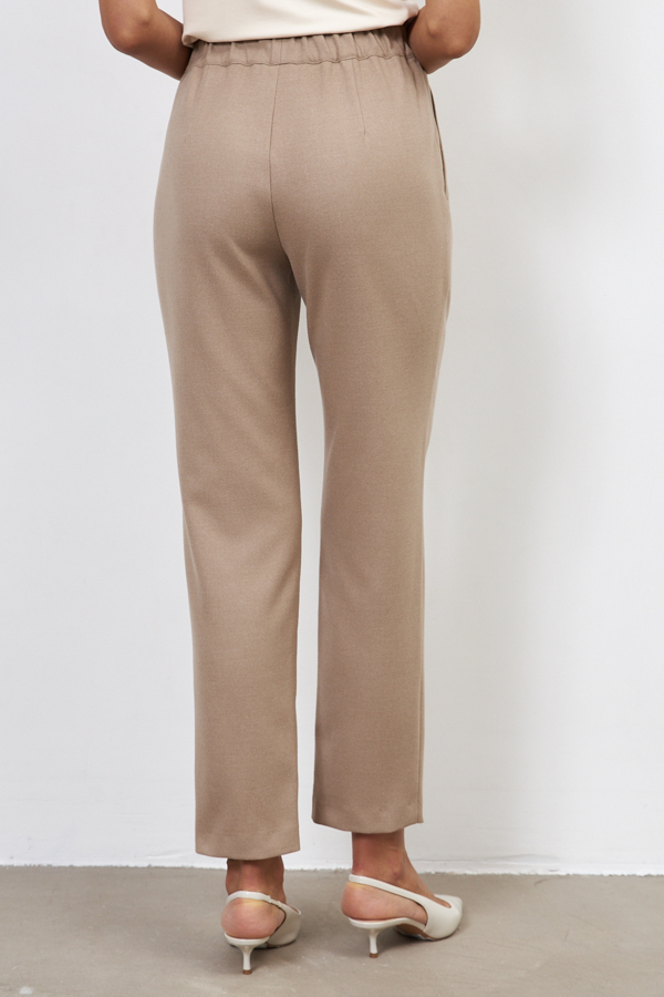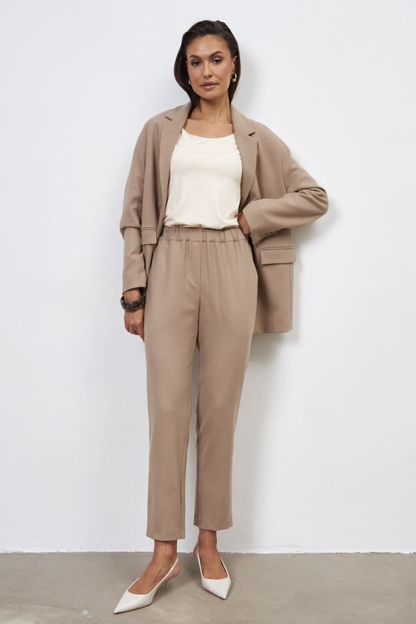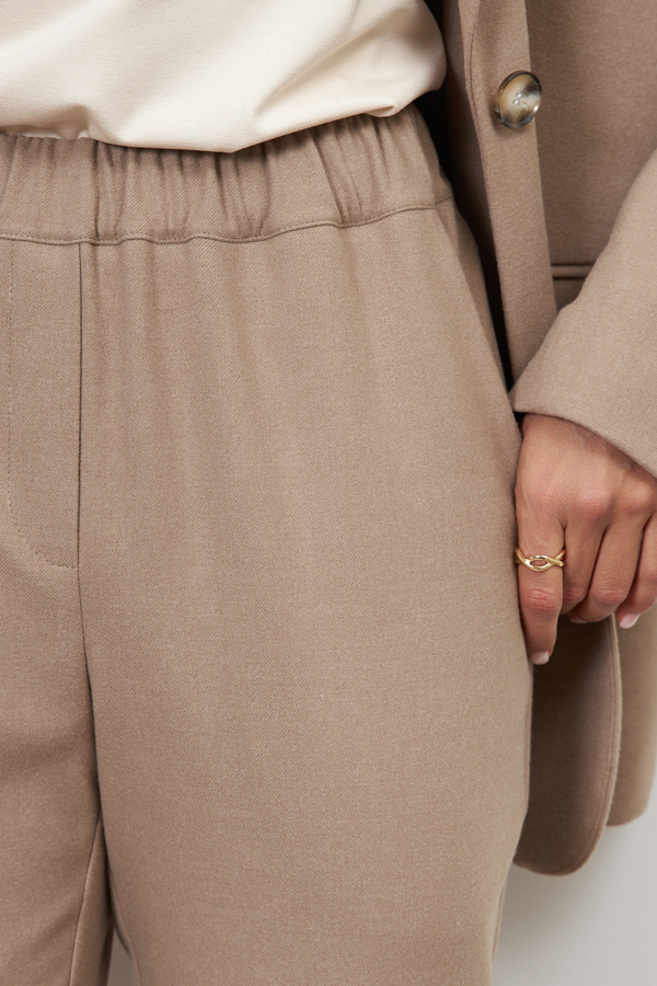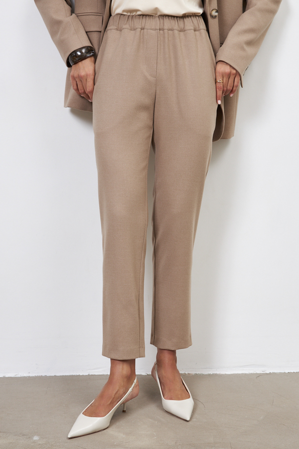 Брюки из костюмной ткани, зауженные книзу. На передней части брюк имитация гульфика, в боковых швах выполнены карманы с подкройным бочком. Пояс притачной с эластичной резиной.