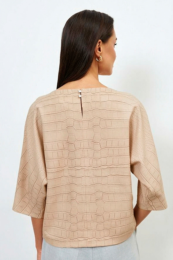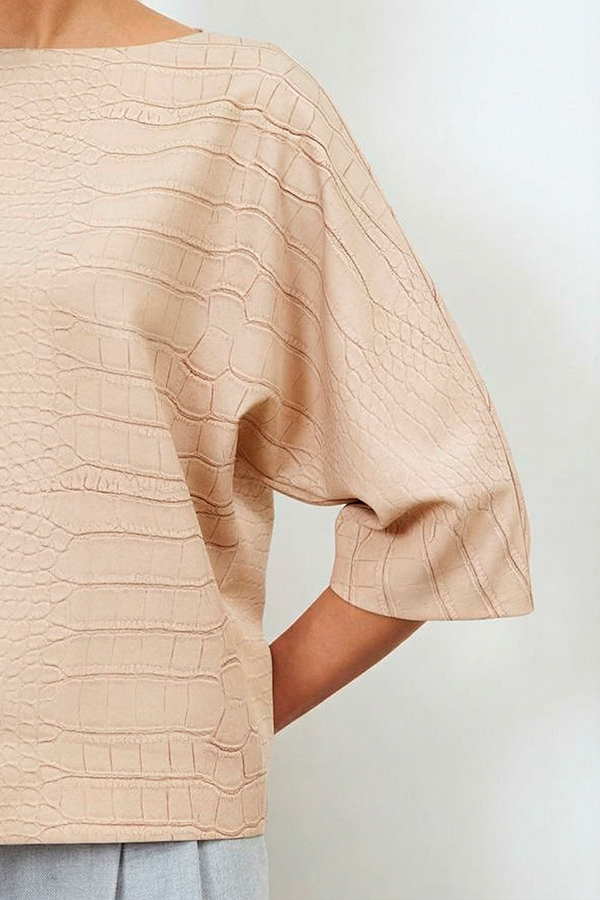 Блуза из плательной ткани свободного силуэта. Вырез горловины «лодочка», сзади застёжка на петли-пуговицы. Цельнокроеный длинный рукав-летучая мышь.