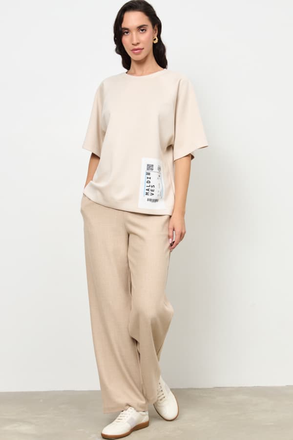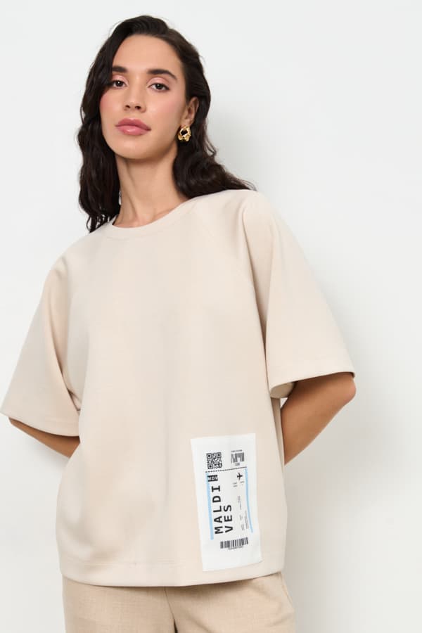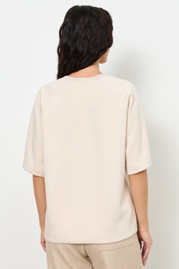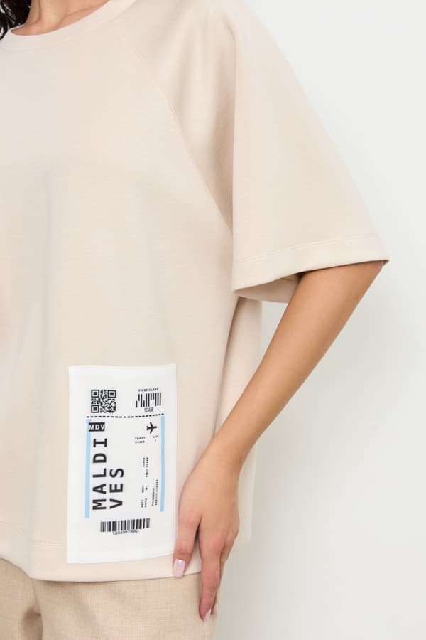 Джемпер из эластичного полотна свободного силуэта. Вырез горловины оформлен бейкой из основной ткани. Короткий рукав реглан. В таблице размеров представлены параметры человека, а не изделия.