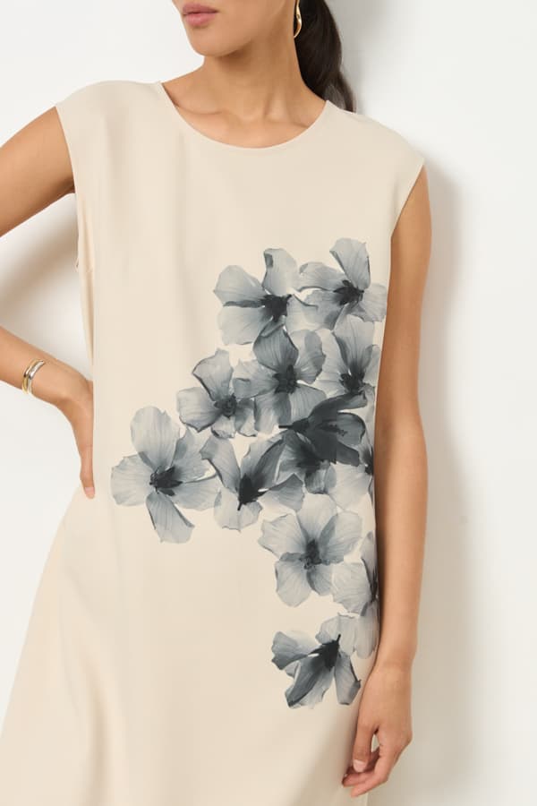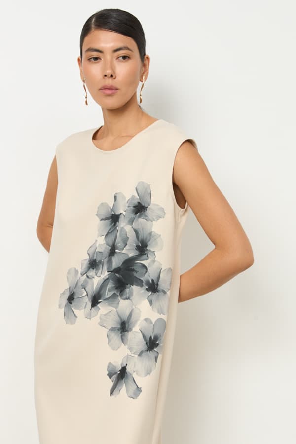 Платье из плательной ткани полуприлегающего силуэта с разрезом в боковом шве. Круглый вырез горловины.