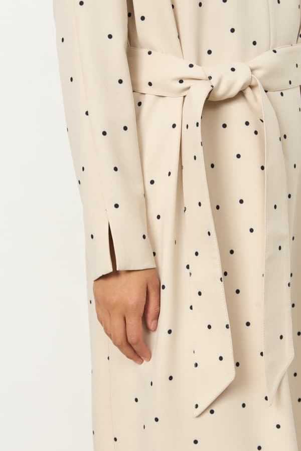 Платье из плательной ткани свободного силуэта. По центру передней части изделия выполнен шов. Цельнокроеная стойка, переходящая в V-образный вырез горловины, визуально делает фигуру стройнее. Втачной длинный рукав с центральным швом и декоративным разрезом по низу. В комплекте - пояс из основной ткани.