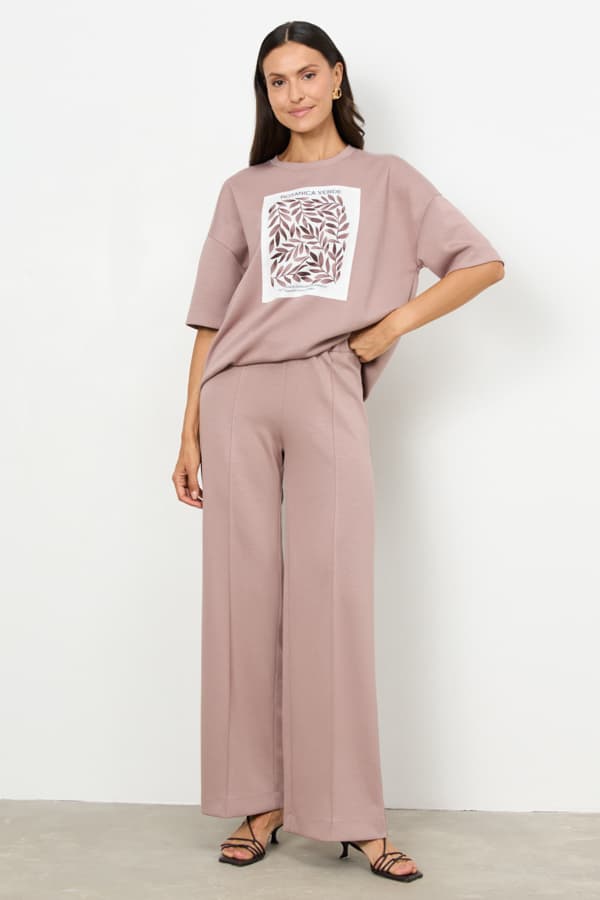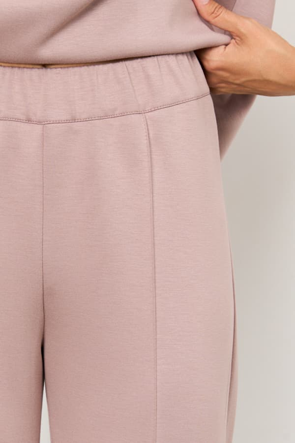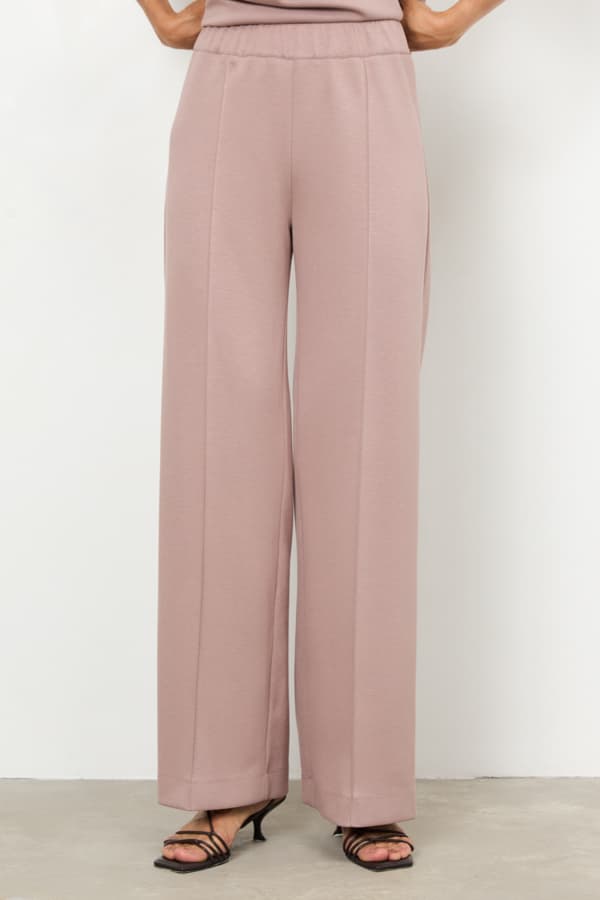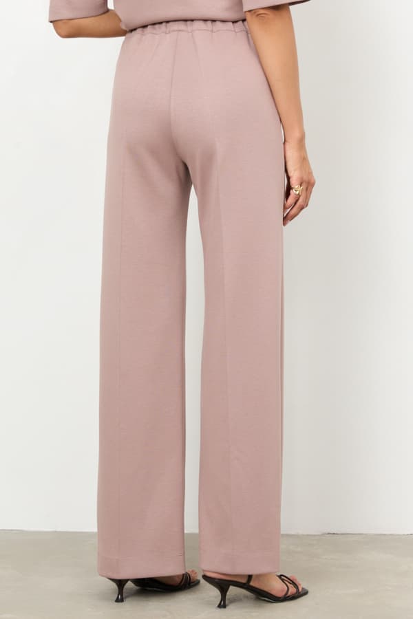 Брюки из эластичного полотна прямого силуэта. Пояс с эластичной резинкой. На передней части брюк застрочены стрелки.