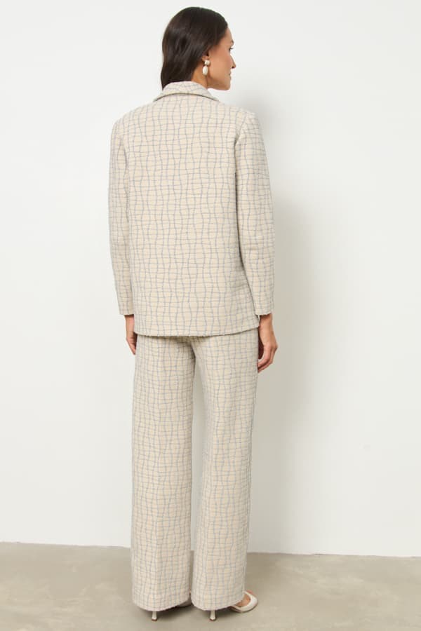 Костюм из эластичного полотна. Брюки прямого силуэта. Пояс с эластичной резинкой. Жакет прямого свободного кроя с женственным шалевым воротником. На передней части изделия застежка на пуговицу. Длинный втачной рукав. Изделие с плечевыми накладками, которые при желании можно убрать.