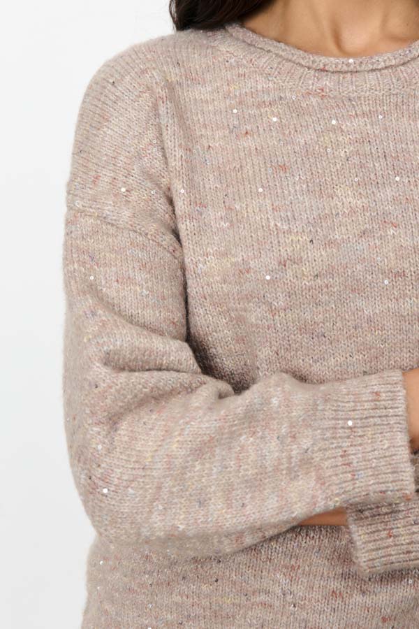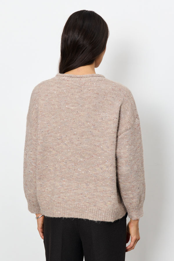 Эластичные манжеты на рукавах и по нижнему краю изделия не только красиво смотрятся, но и надежно защищают от ветра. Изделие выполнено из меланжевой пряжи с пайетками.