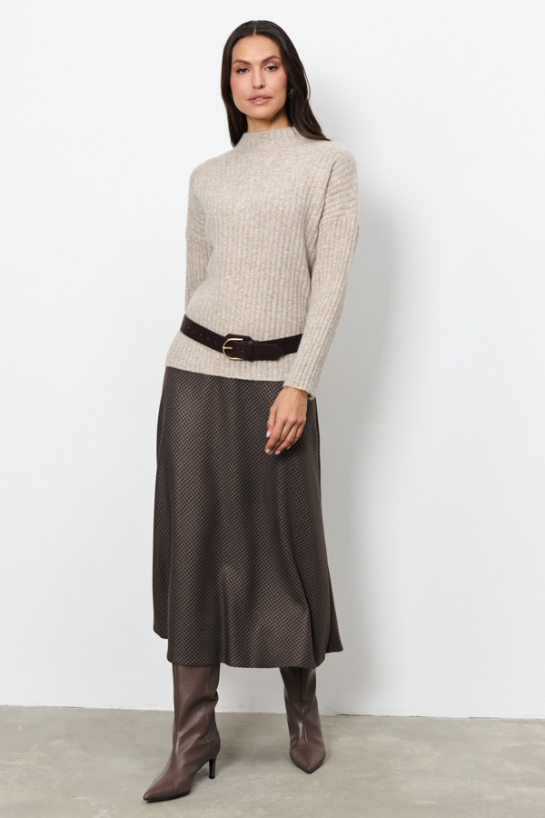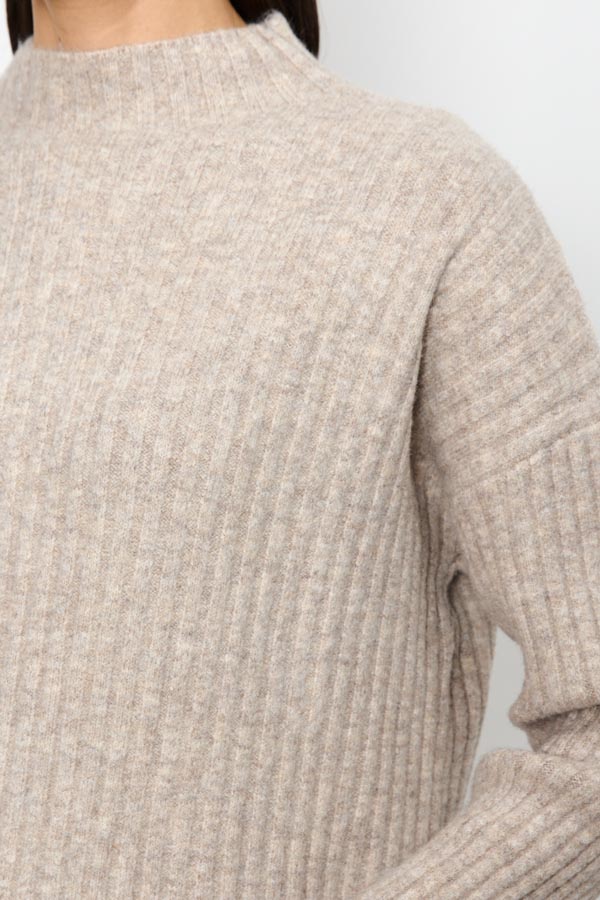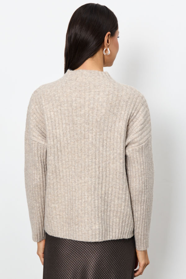 Этот джемпер – воплощение комфорта и стиля. Его свободный силуэт и мягкая фактура в рубчик создают расслабленный, но элегантный образ. Длинные рукава со спущенной проймой добавляют непринужденности, а цельнокроеный воротник-стойка придает завершенность. Изделие выполнено из меланжевой пряжи.