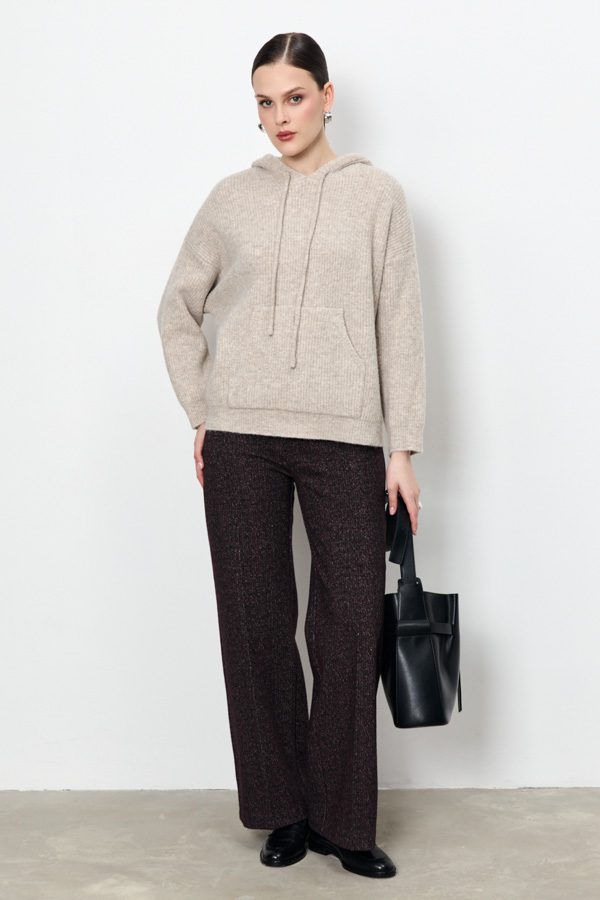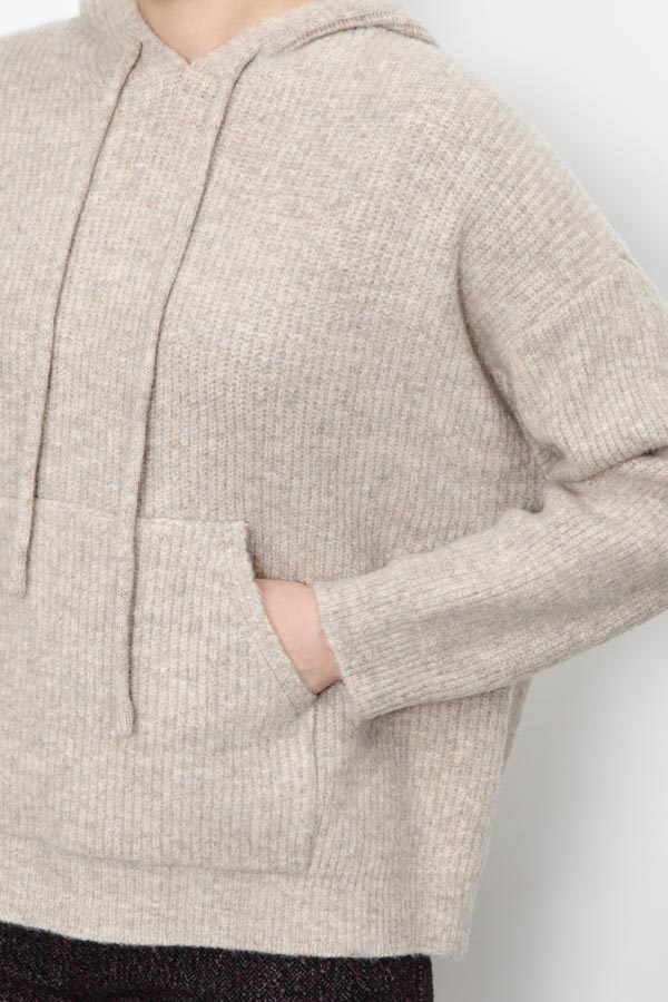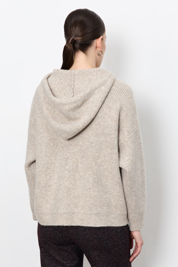 Джемпер свободного кроя с актуальным рубчиком станет основой для множества образов. Капюшон с завязками и вместительный карман-кенгуру – это не только практично, но и очень модно. Спущенная линия плеча и длинные рукава подчеркивают непринужденность силуэта. Изделие выполнено из меланжевой пряжи.