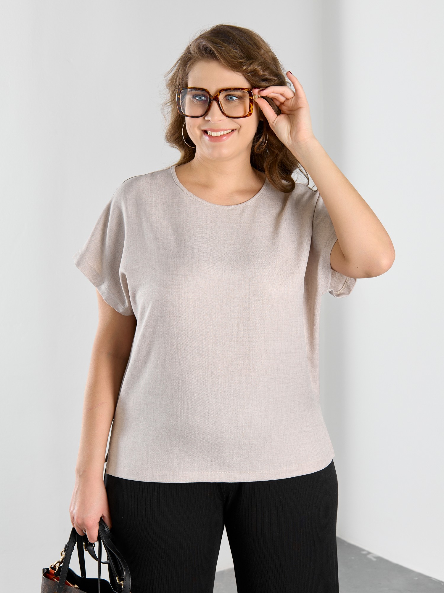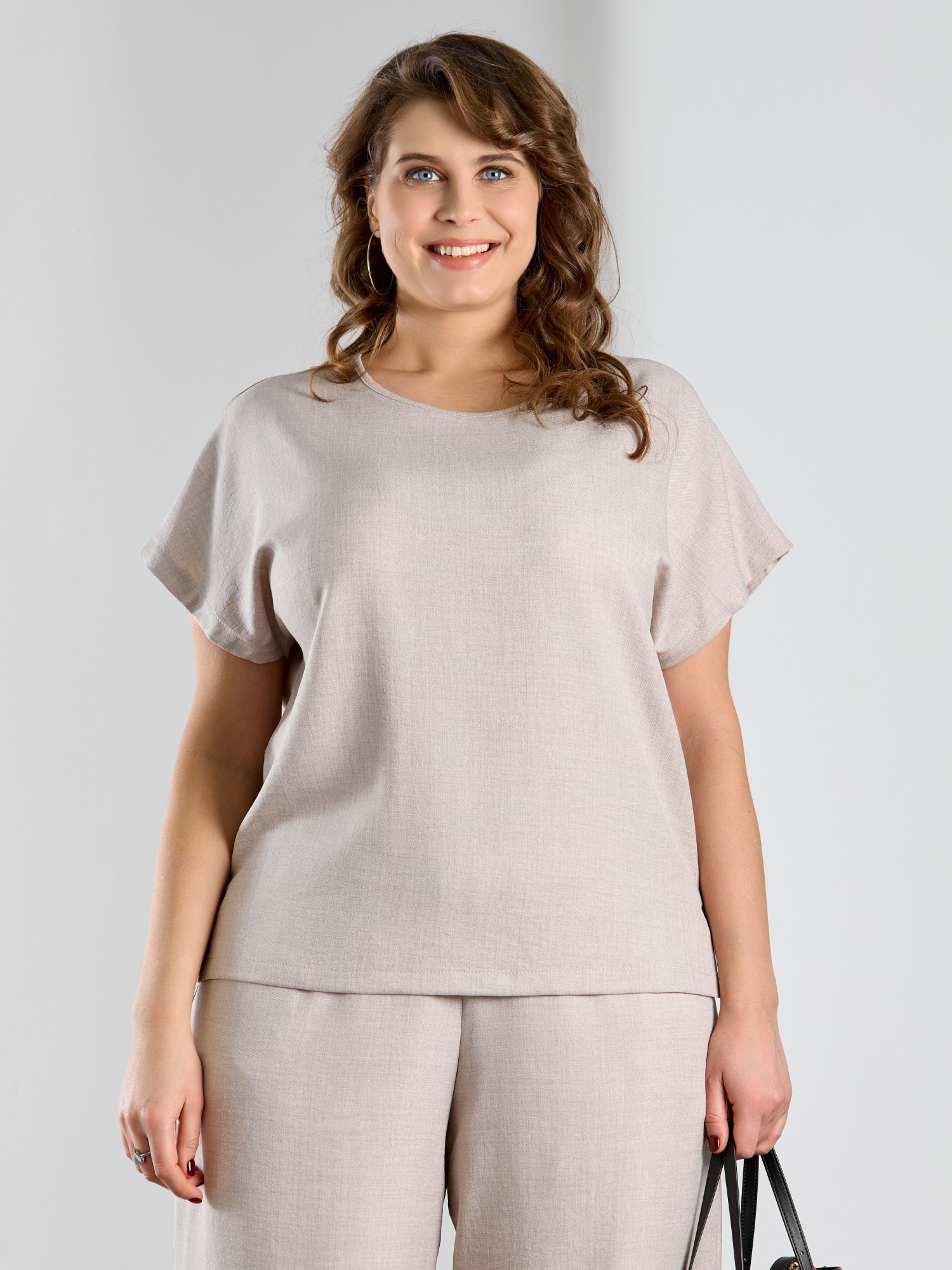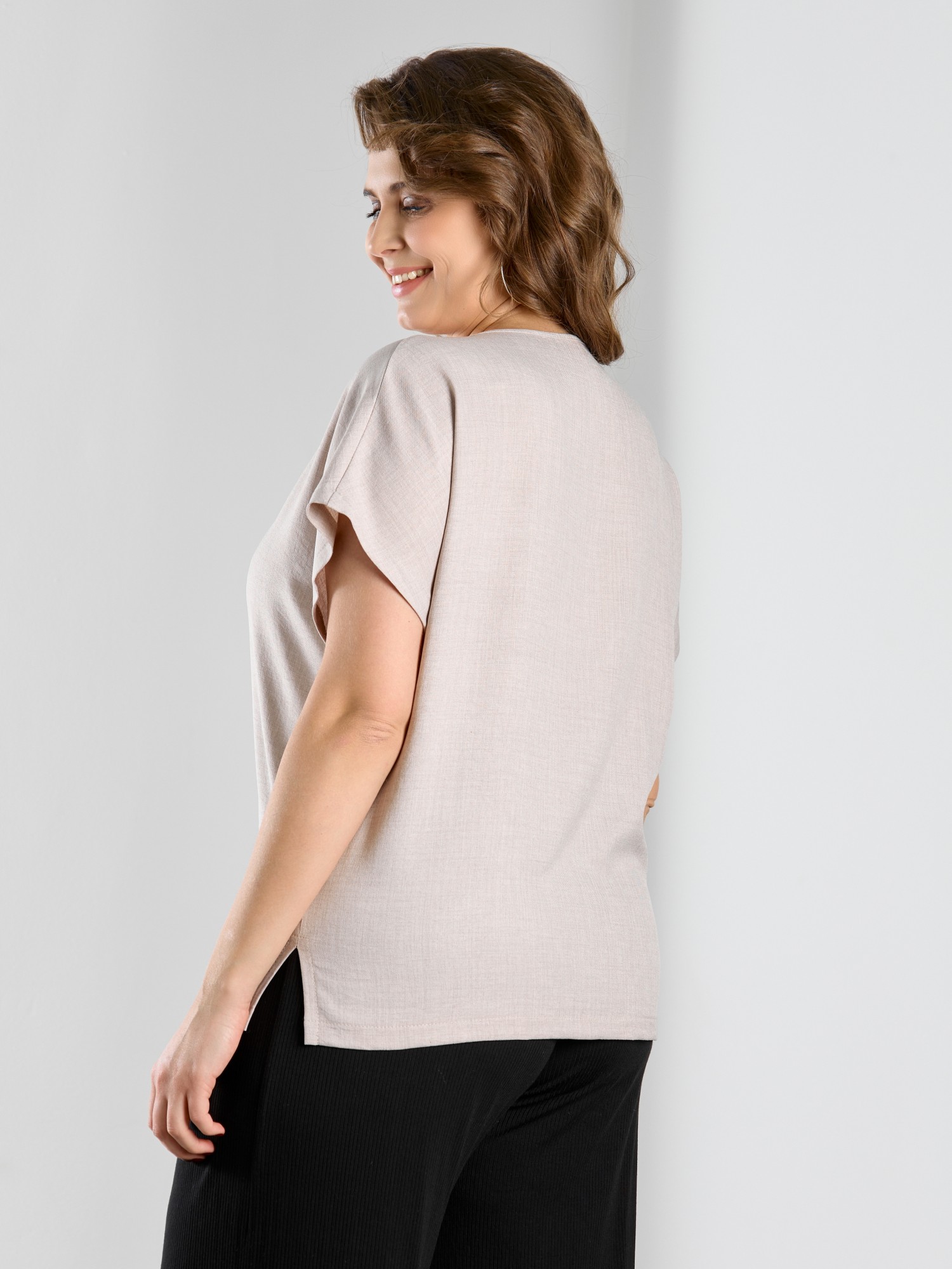 Блуза женская из гладкокрашеного тканого полотна, прямого силуэта, с горловиной овальной формы и цельнокроеными рукавами. Горловина окантована основным материалом, в боковых швах небольшие разрезы.