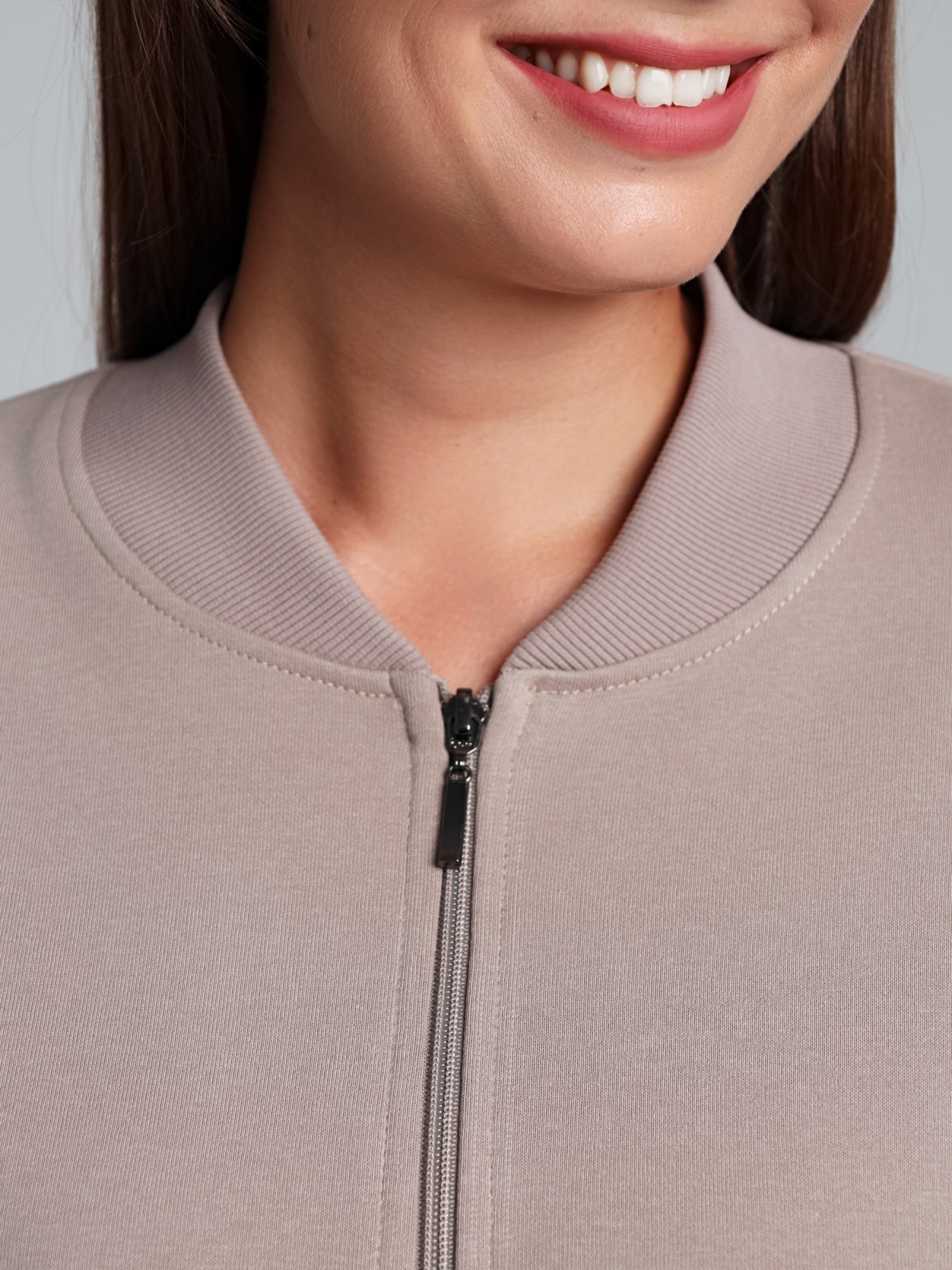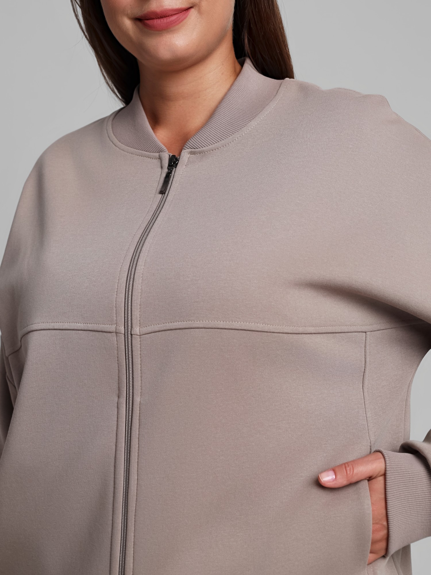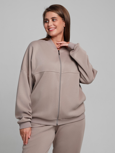 Куртка – женская из гладкокрашенного трикотажного полотна «лининг» прямого силуэта, свободная, с длинными втачными рукавами, горловиной овальной формы, обработанной втачной планкой, центральной бортовой застежкой на тесьму «молния». Полочка состоит из трех деталей, на нижней части в рельефах выполнены карманы, низ изделия с притачным поясом, рукава с притачными манжетами. Пояс, планка горловины, манжеты рукавов выполнены из трикотажного полотна «кашкорсе».