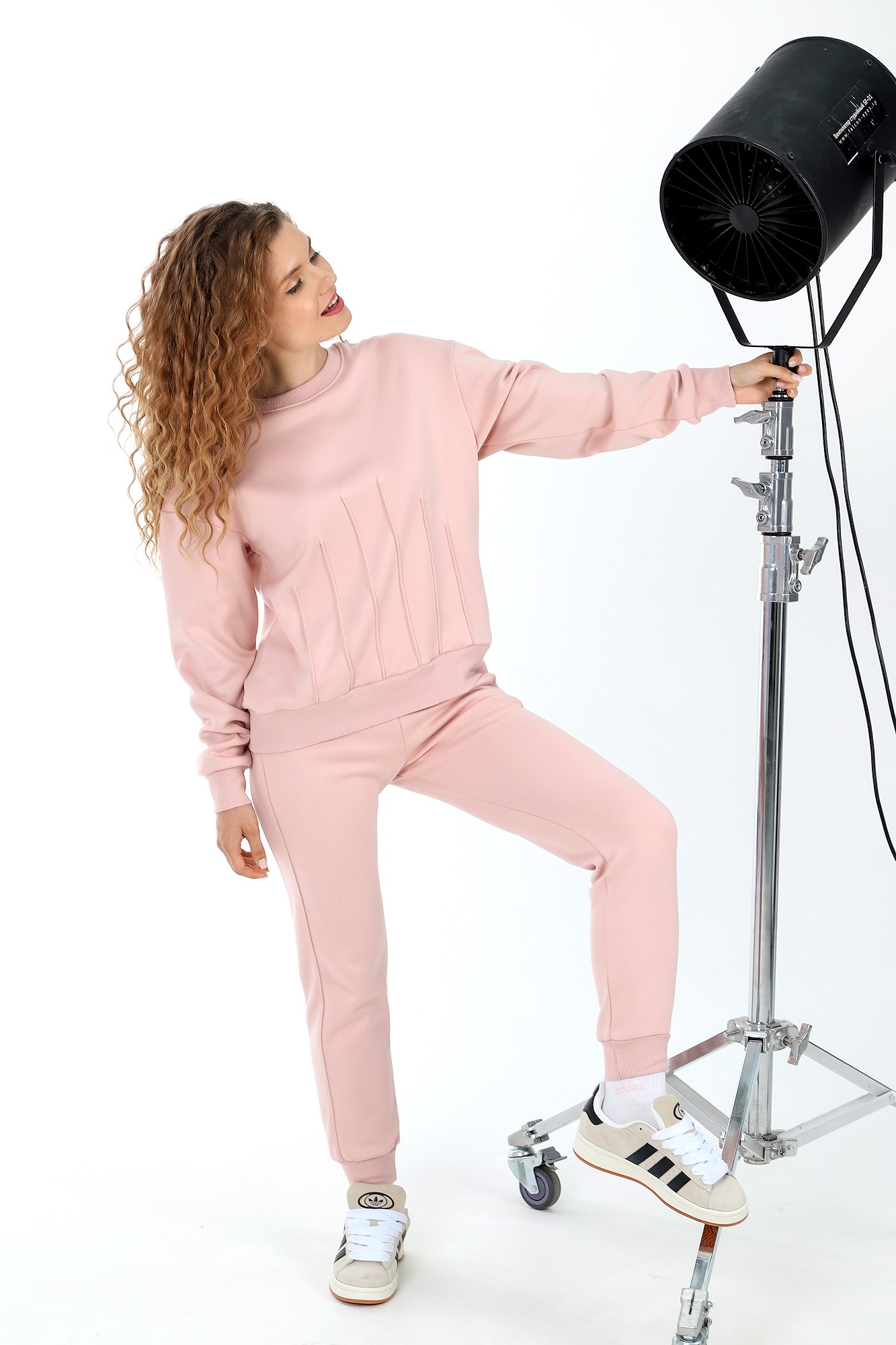 Костюм молодежный из гладкокрашеного трикотажного полотна «футер-интерсофт», состоящий из джемпера и брюк Джемпер – свободного покроя, с длинными втачными рукавами, горловиной овальной формы, обработанной втачной планкой и притачным поясом по низу. Рукава – с притачными манжетами. Манжеты, планка горловины и пояс выполнены из полотна «кашкорсе» такого же цвета, как и основной материал. На полочке застрочены декоративные складочки-защипы, расположенные симметрично относительно линии центра. Брюки – длинные, на притачном поясе с эластичной тесьмой внутри и манжетами по низу. Передние половины – из двух частей каждая, со смещением соединтельных швов в сторону боковых срезов. Соединительные швы передних половин обработаны с карманами. Пояс и манжеты выполнены из трикотажного полотна «кашкорсе».