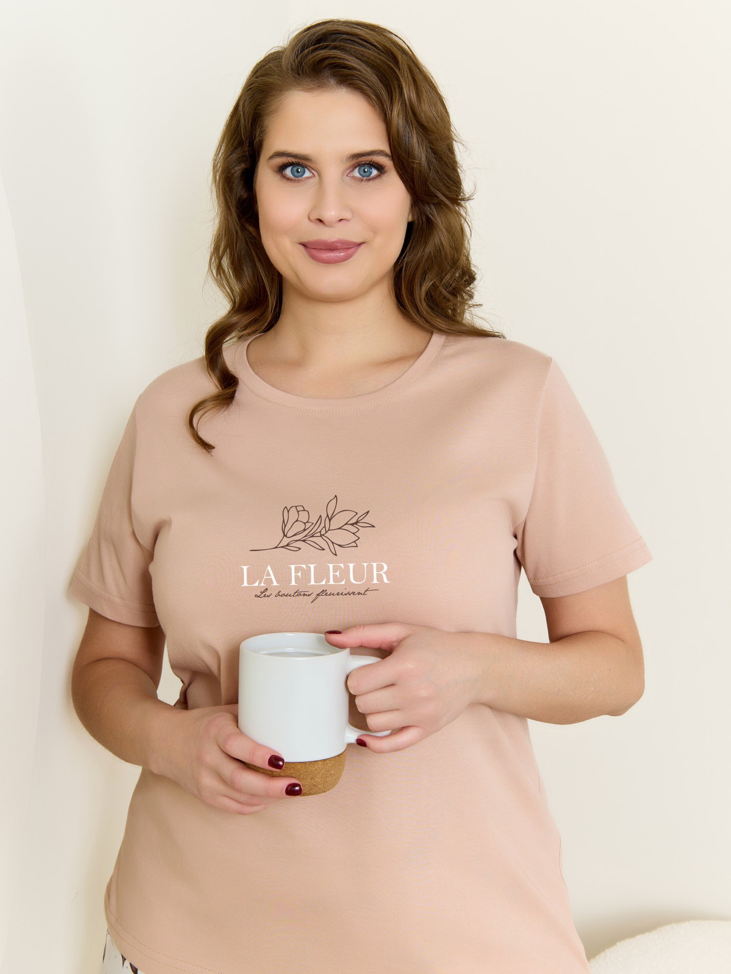 Пижама женская из трикотажного полотна «кулирка» в комбинации двух видовполотен: гладкокрашенного и с набивным рисунком, состоящая из футболки и шорт. Футболка женская из гладкокрашеного трикотажного полотна «кулирка», классического покроя, с короткими втачными рукавами, горловиной овальной формы, обработанной притачной бейкой из основного материала и принтом на полочке, выполненным в технике «шелкографии».Шорты – из полотна с набивным рисунком, удлиненные, свободного покроя, с эластичной тесьмой по талии.