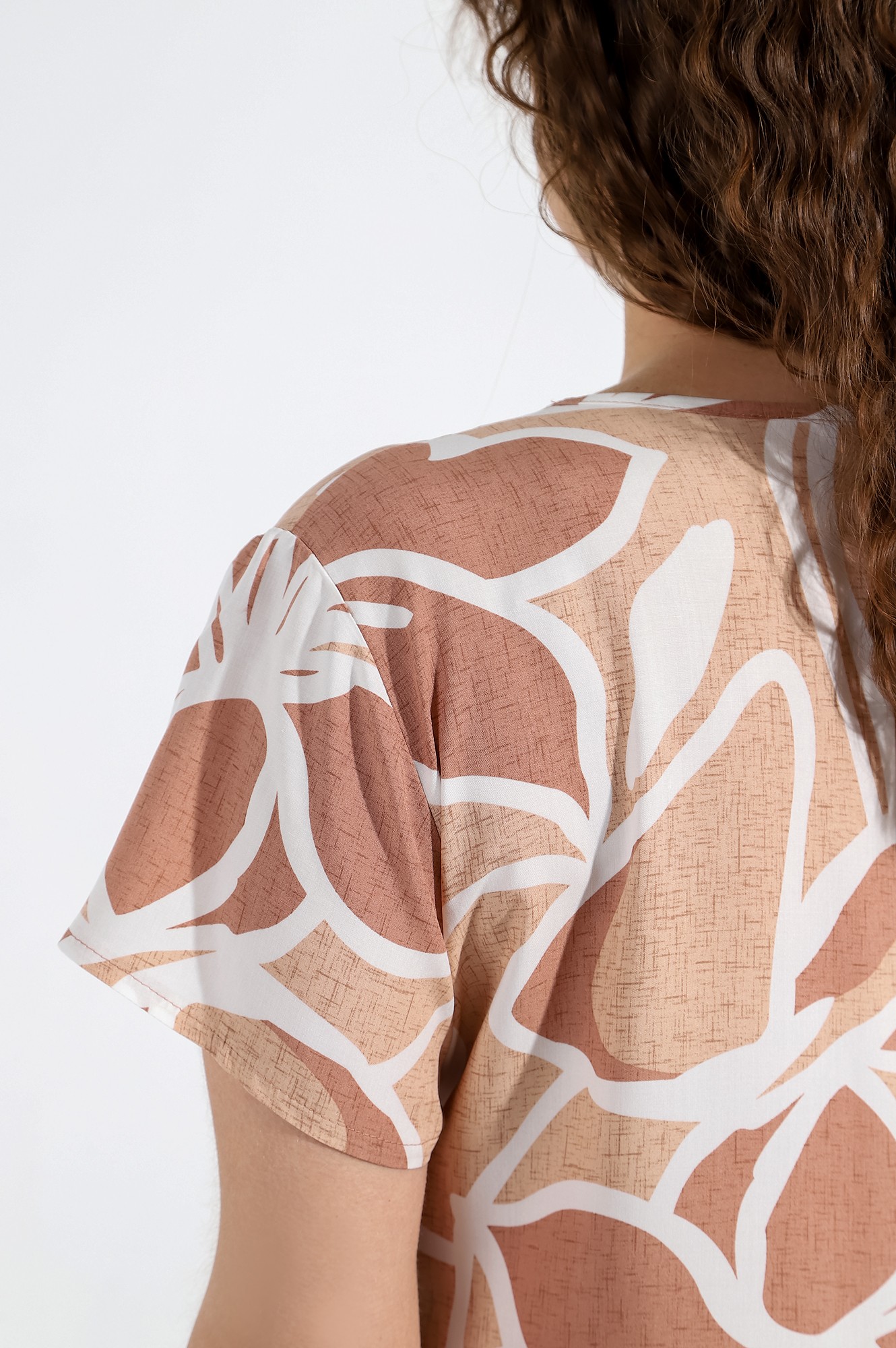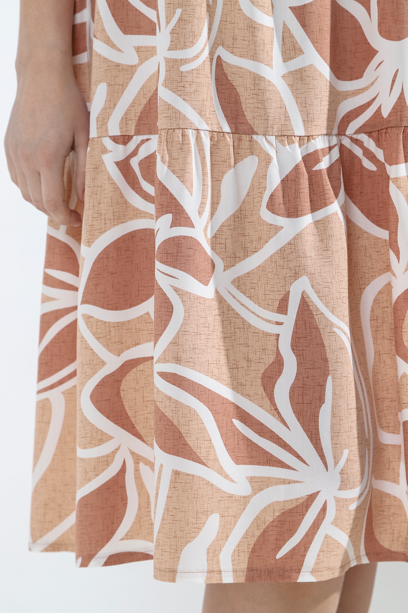 Платье из плательной штапельной ткани с набивным рисунком, свободного покроя, отрезное по линии талии, с короткими втачными рукавами и горловиной овальной формы, обработанной обтачкой. Полочка – с вытачками в области груди. Юбка – из двух ярусов, каждый из которых присборен по шву соединения с верхней деталью.
