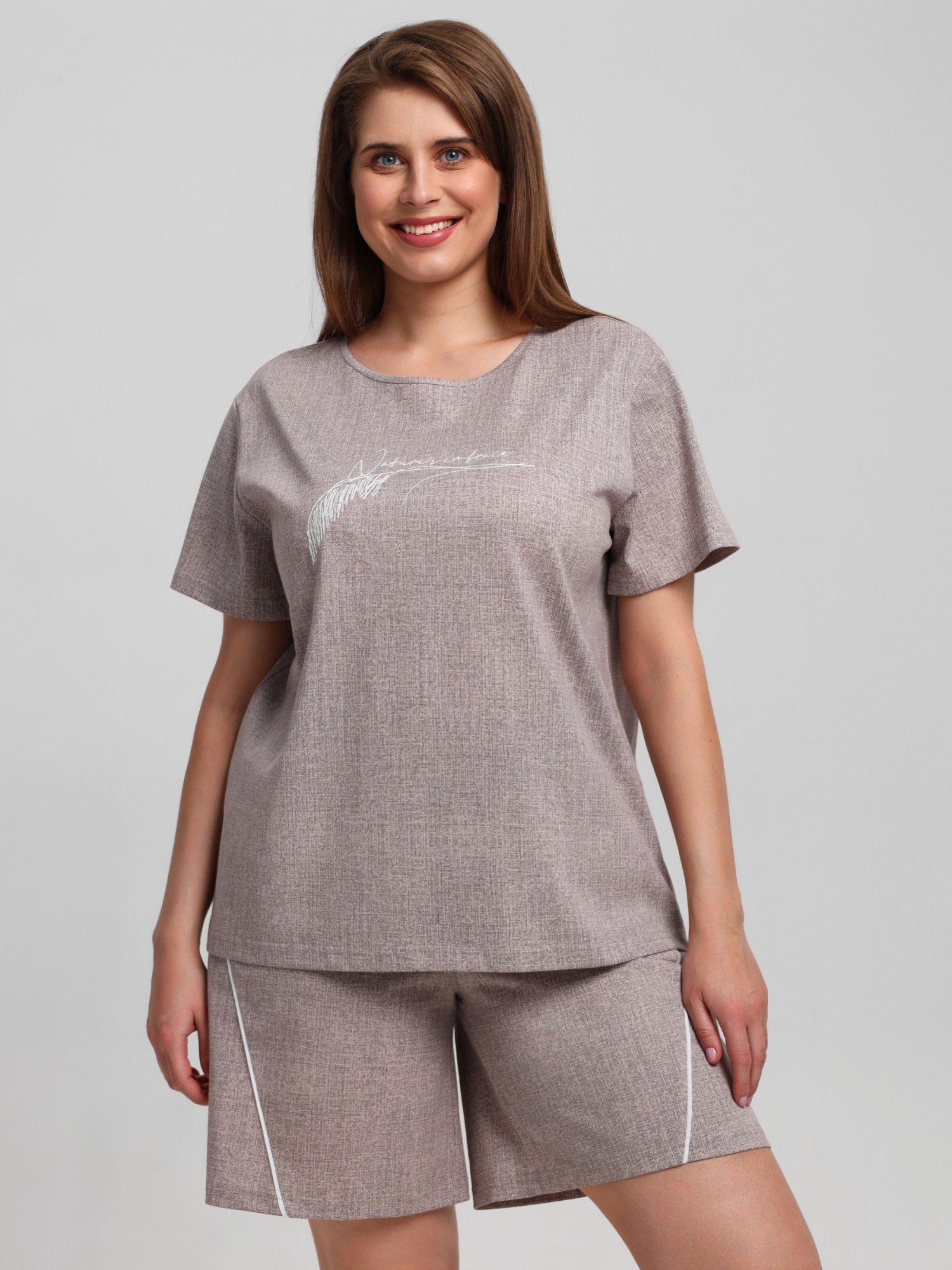 Костюм женский из трикотажного полотна «кулирка» с набивным рисунком, состоящий Футболка – из полотна с набивным рисунком, свободного покроя, с короткими втачными рукавами, горловиной овальной формы, окантованной основным материалом. На полочке выполнена вышивка.Шорты - из полотна с набивным рисунком, свободные, с карманами в боковых швах, на притачном поясе с эластичной тесьмой внутри. Детали передних половин разрезаны по косой, в шве соединения кант контрастного цвета.