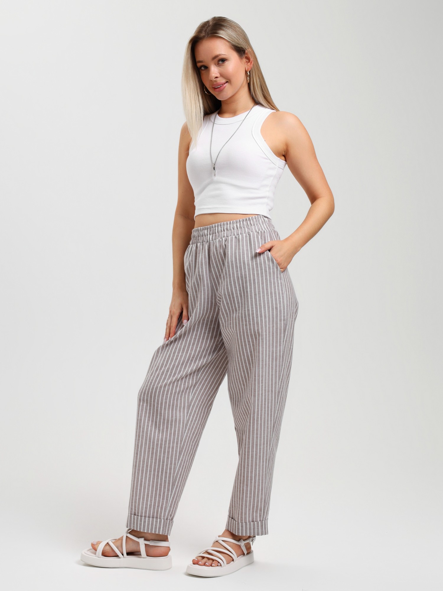 Брюки молодежные из тканого полотна с набивным рисунком в полоску, свободного покроя, с карманами в боковых швах, на притачном поясе с эластичной тесьмой внутри.