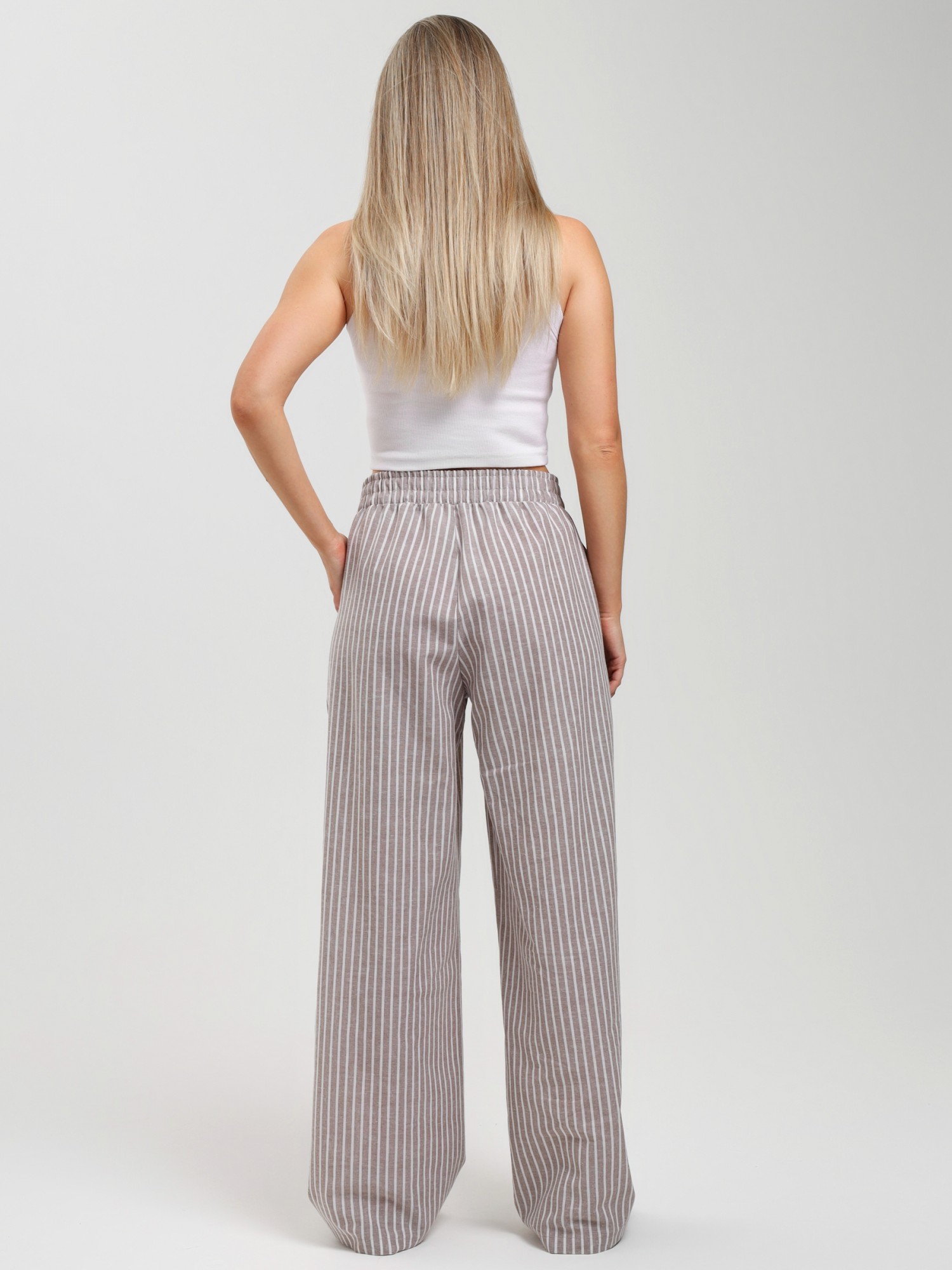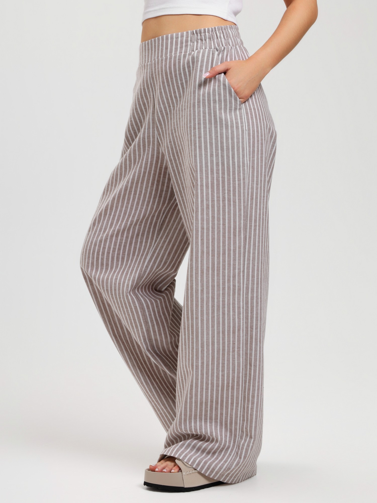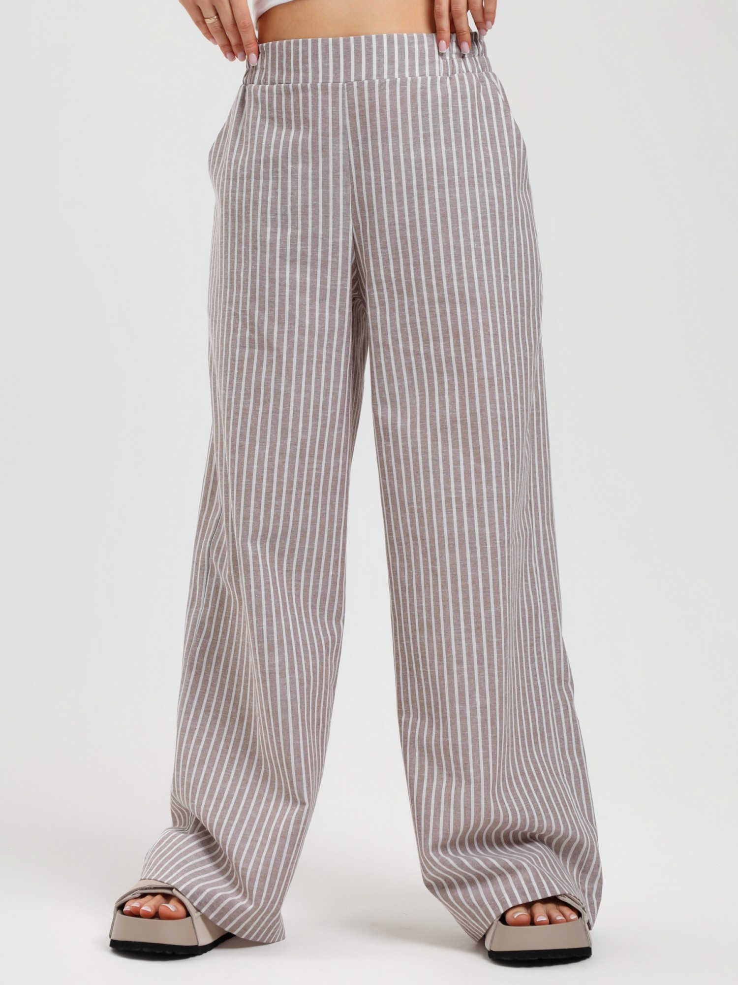 Брюки молодежные из тканого полотна с набивным рисунком в полоску, свободного покроя, с карманами в боковых швах, на притачном поясе с эластичной тесьмой внутри.