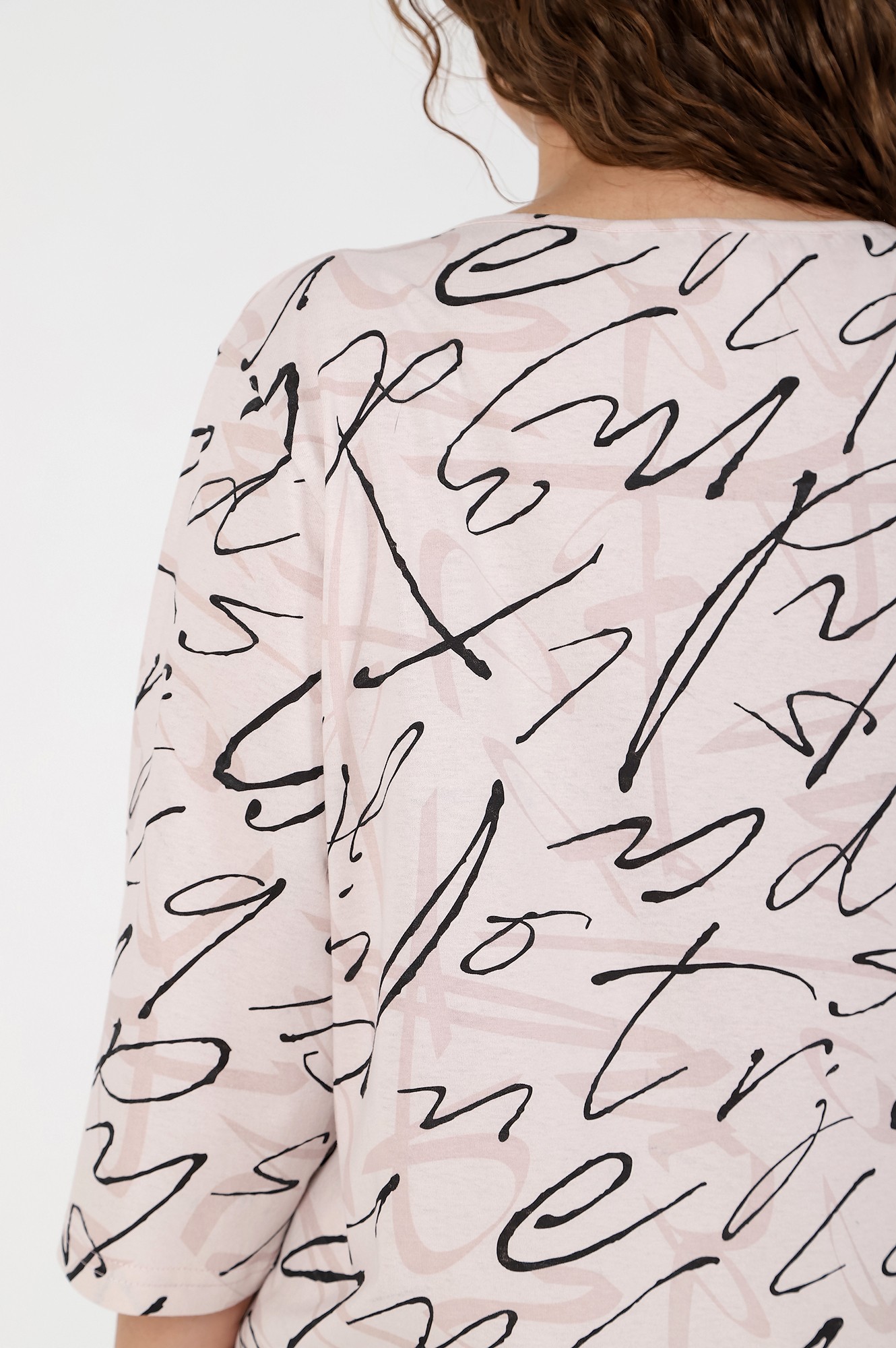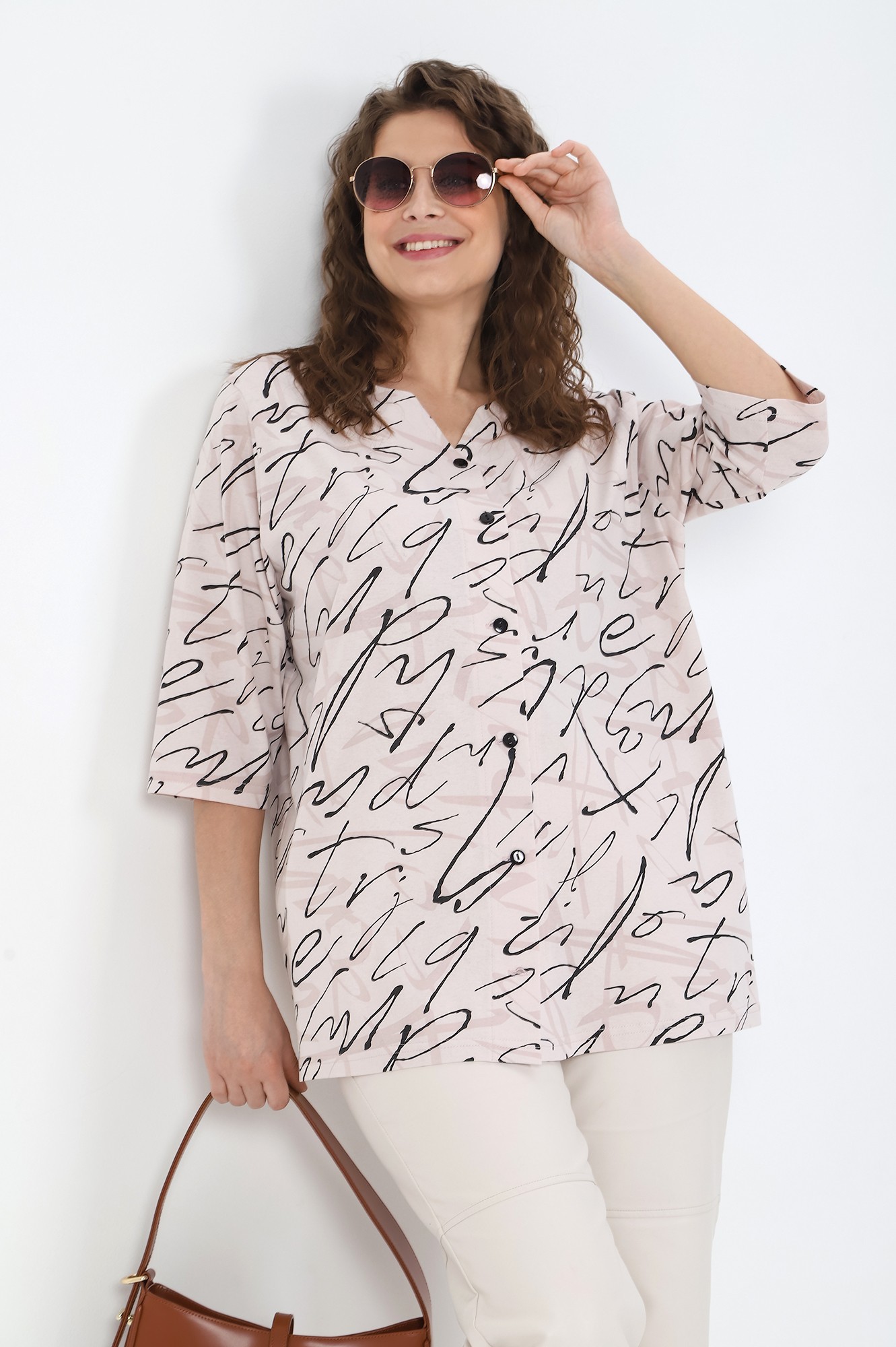 Блуза женская свободного покроя, из трикотажного полотна «кулирка», с рукавами ¾ длины, центральной бортовой застежкой на петли и пуговицы. V-образная горловина переда обработана обтачками, спинки – окантована.