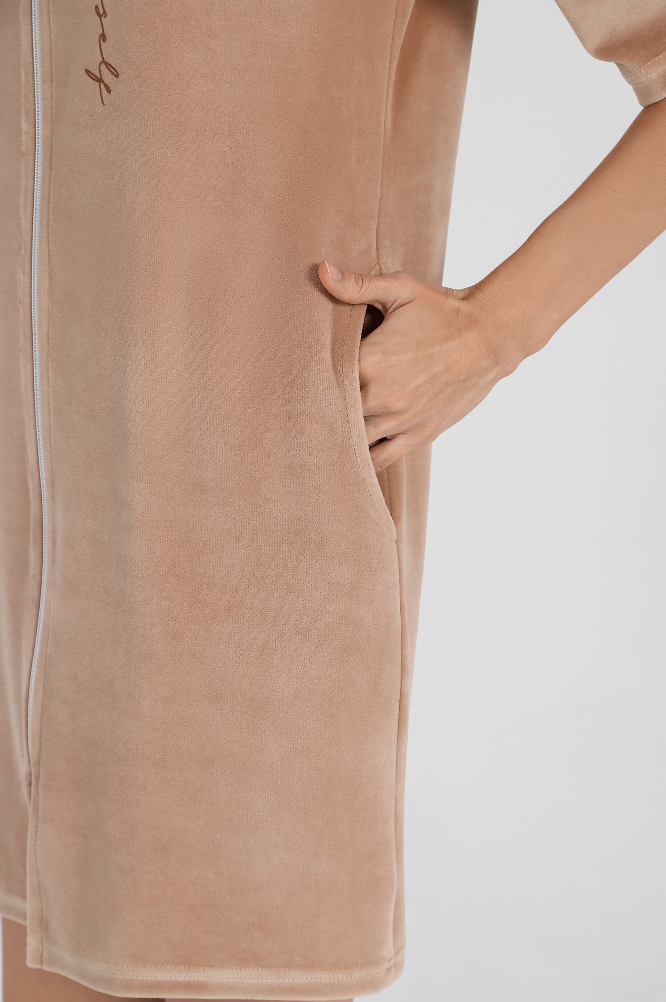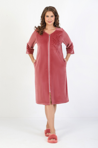 Халат из гладкокрашеного полотна «велюр», прямого силуэта, с втачными рукавами длиной ¾, горловиной овальной формы, карманами в боковых швах и центральной бортовой застежкой на тесьму «молния». На полочке выполнена печать в технике «шелкографии».