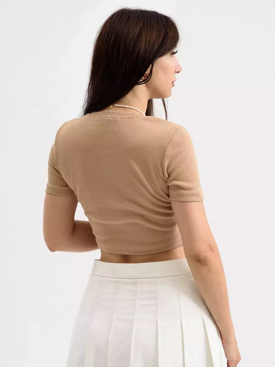 Футболка укороченная женская спортивного стиля, прилегающего силуэта- тренд сезона, выполнена из трикотажного х/б полотна с выработкой «рубчик» . Круглая горловина обработана бейкой из основного материала. Короткий втачной рукав.
