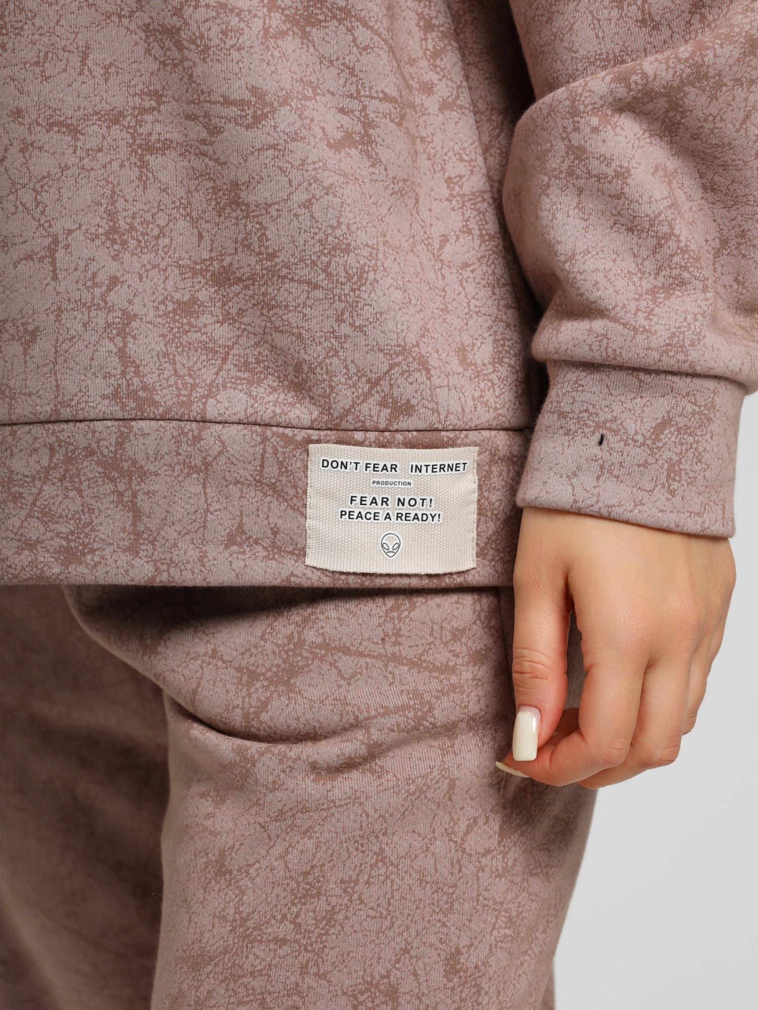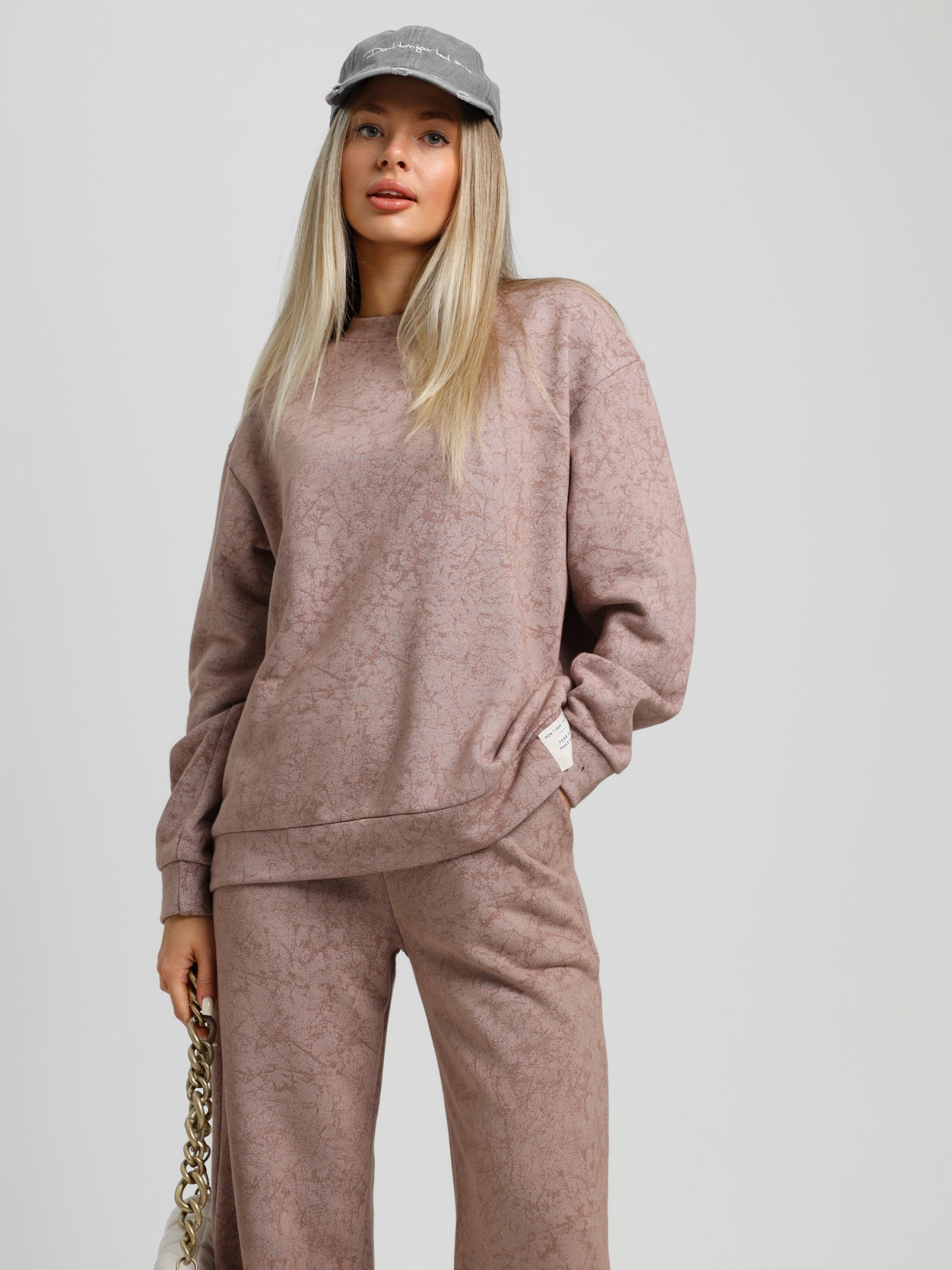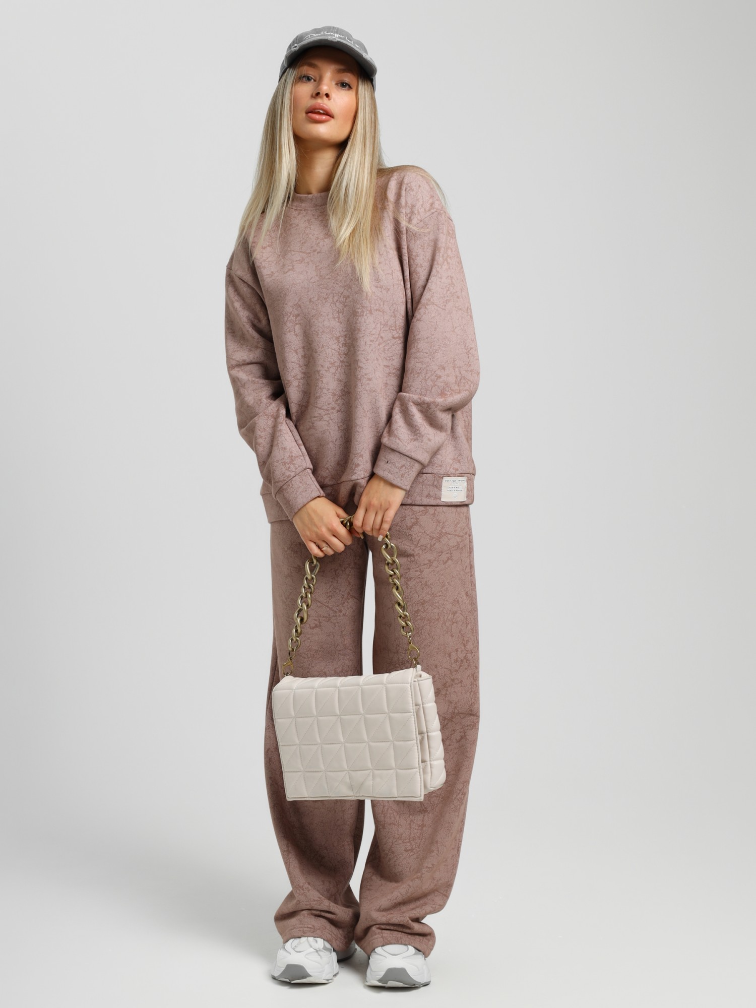 Костюм молодежный из трикотажного полотна футер трехнитка с «эффектом замши», состоящий из джемпера и брюк. Джемпер – прямого силуэта, с длинными втачными рукавами, горловиной овальной формы, обработанной втачной планкой. Рукава с манжетами, низ - с притачным поясом, дополненным декоративным элементом-нашивкой.Брюки – длинные, свободные, на притачном поясе с эластичной тесьмой внутри, карманами в боковых швах.