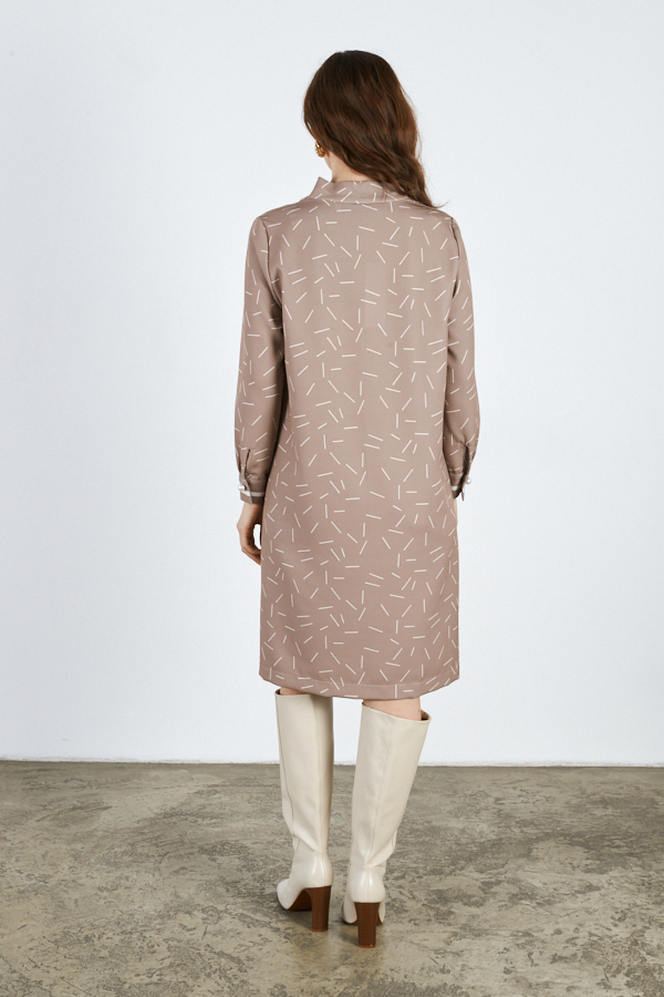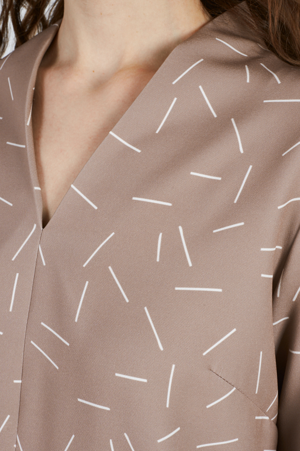 Платье свободного силуэта из плательной ткани. По центру передней части изделия выполнен шов. Цельнокроеная стойка, переходящая в V-образный вырез горловины, визуально делает фигуру стройнее. Втачной длинный рукав. Низ рукава на манжете с застёжкой на пуговицы-жемчужины.