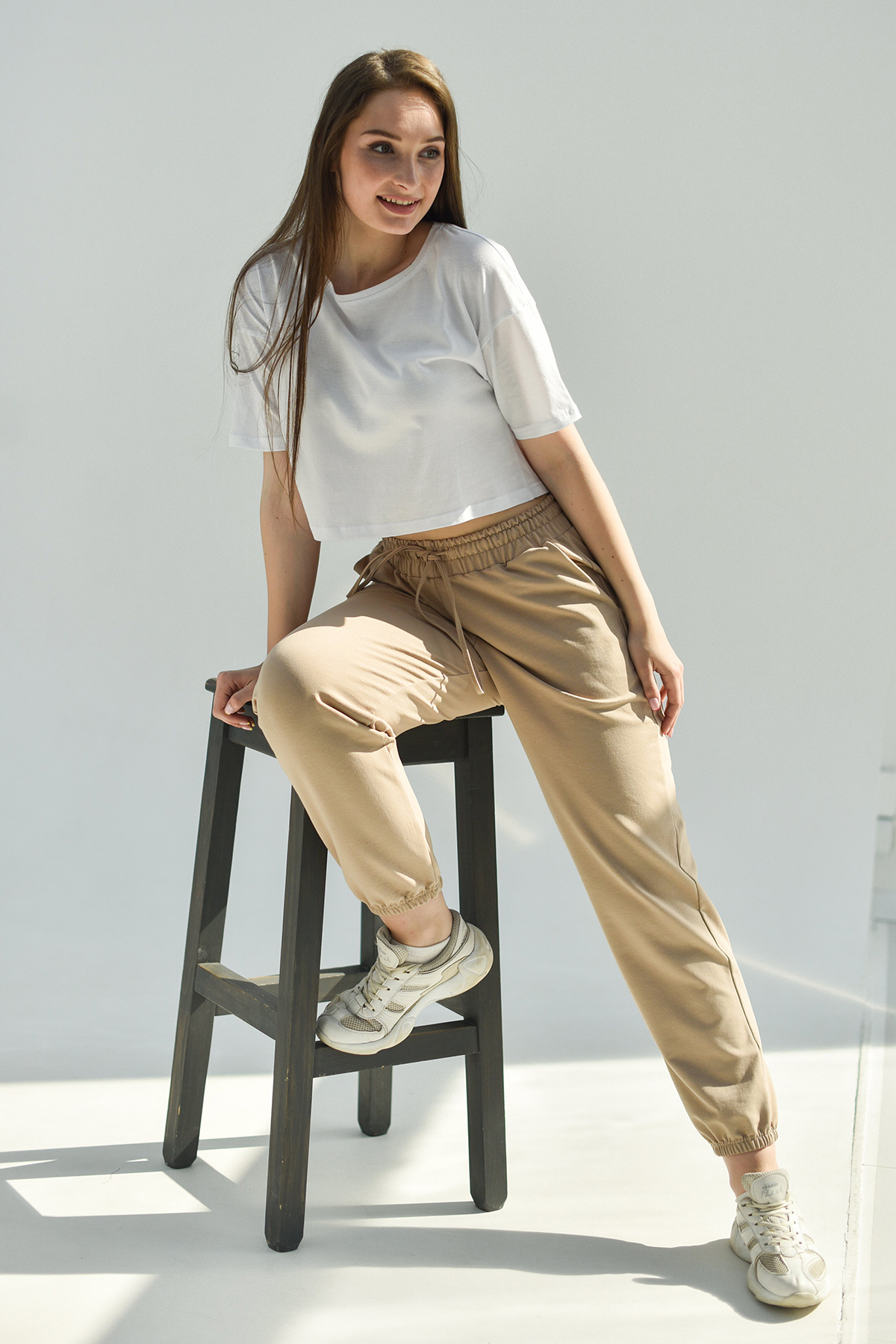 Брюки женские спортивного стиля из гладкокрашенного трикотажного полотна футер с лайкрой. Брюки подойдут девушкам, любящим свободу движения и активный образ жизни, универсальны для дома, прогулок, для спорта и занятий танцами. Широкий отрезной пояс на резинке дополнительно регулируется шнуром. Удобные карманы с отрезным бочком. Низ брюк на резинке.