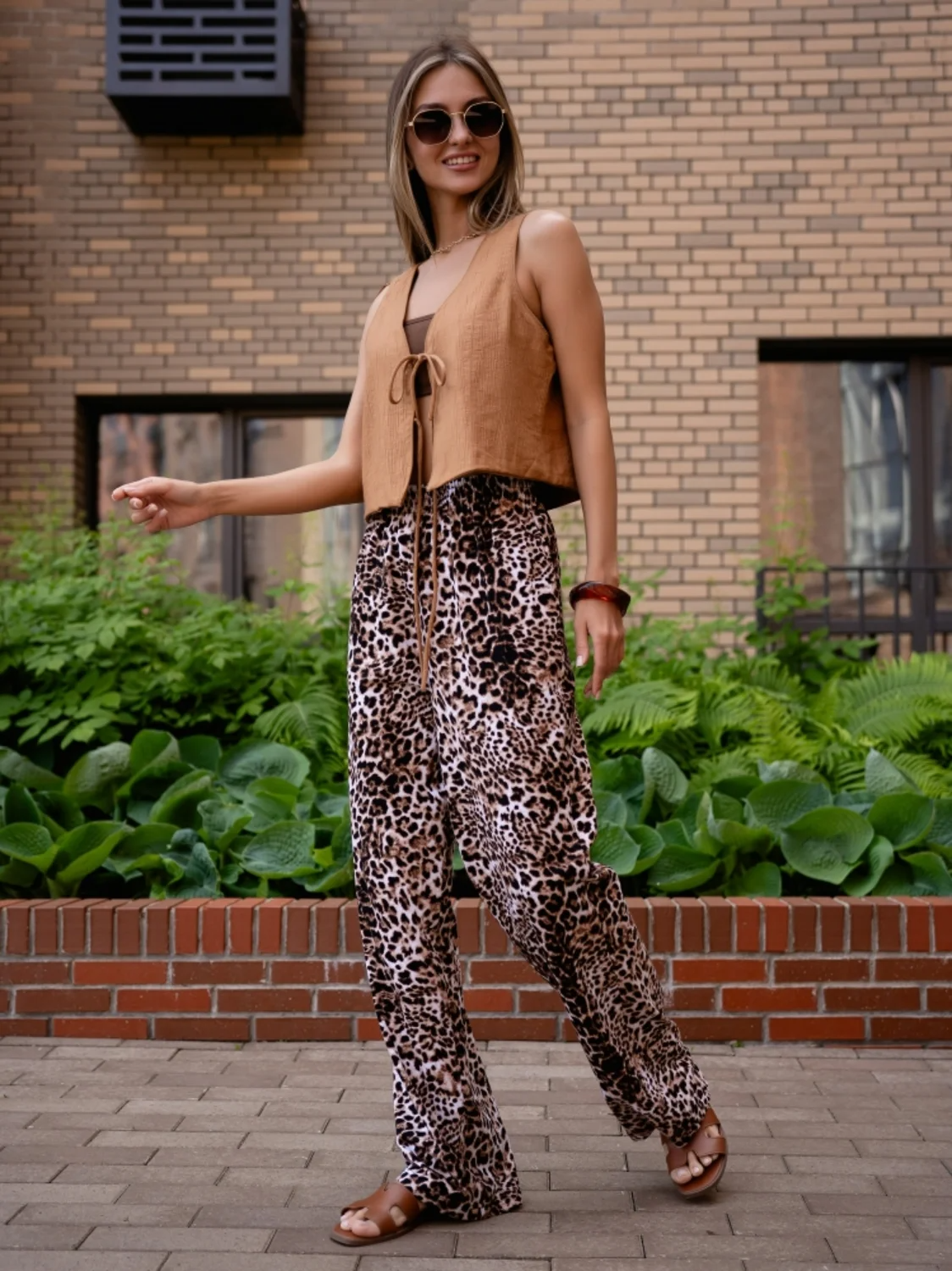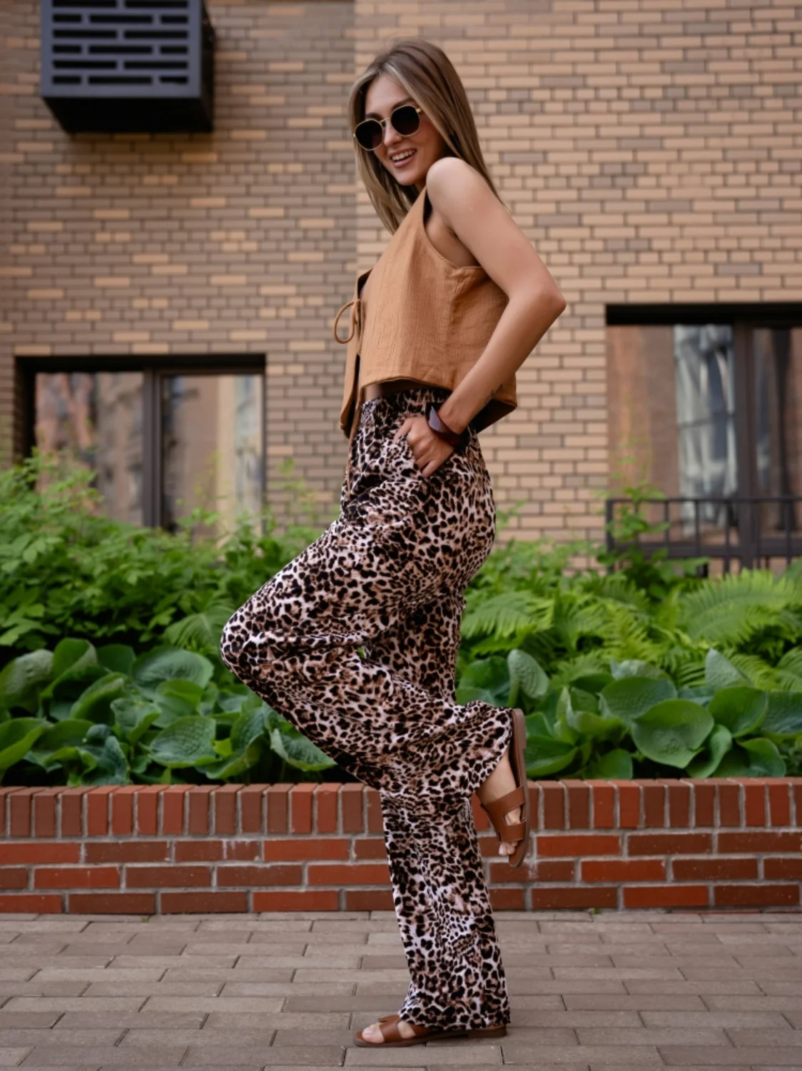 Леопардовый принт придает брюкам неповторимый вид и стиль. Резинка на талии обеспечивает отличную посадку и комфорт при ношении.