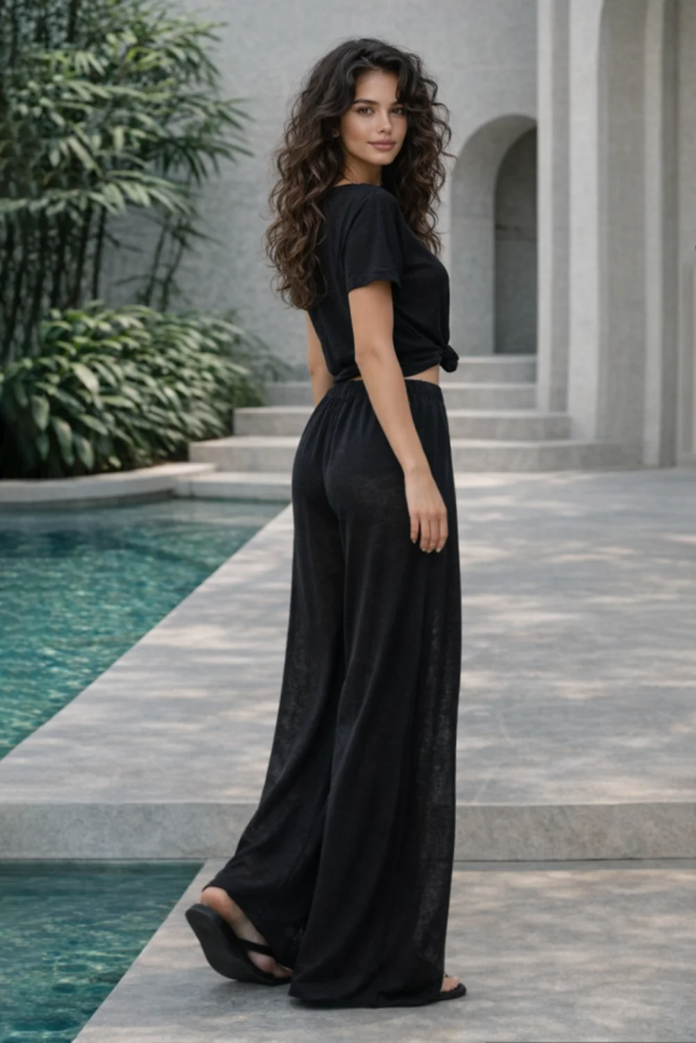 Широкие брюки из мягкой струящейся ткани с легкой полупрозрачностью — универсальная модель для повседневных и летних образов. Модель с высокой посадкой и широкой эластичной резинкой на талии обеспечивает комфортную посадку, а свободный крой красиво подчеркивает силуэт и добавляет легкости движению. Внутри предусмотрены вшитые шорты из основной ткани, что делает модель более практичной и удобной в носке. Низ брюк оставлен без обработки, создавая естественный, лаконичный край. Брюки отлично подойдут для летних прогулок, отдыха у моря, путешествий или городских образов в теплую погоду — их легко сочетать как с базовыми топами, так и с более акцентными вещами. Состав: вискоза 55%, полиэстер 45%.