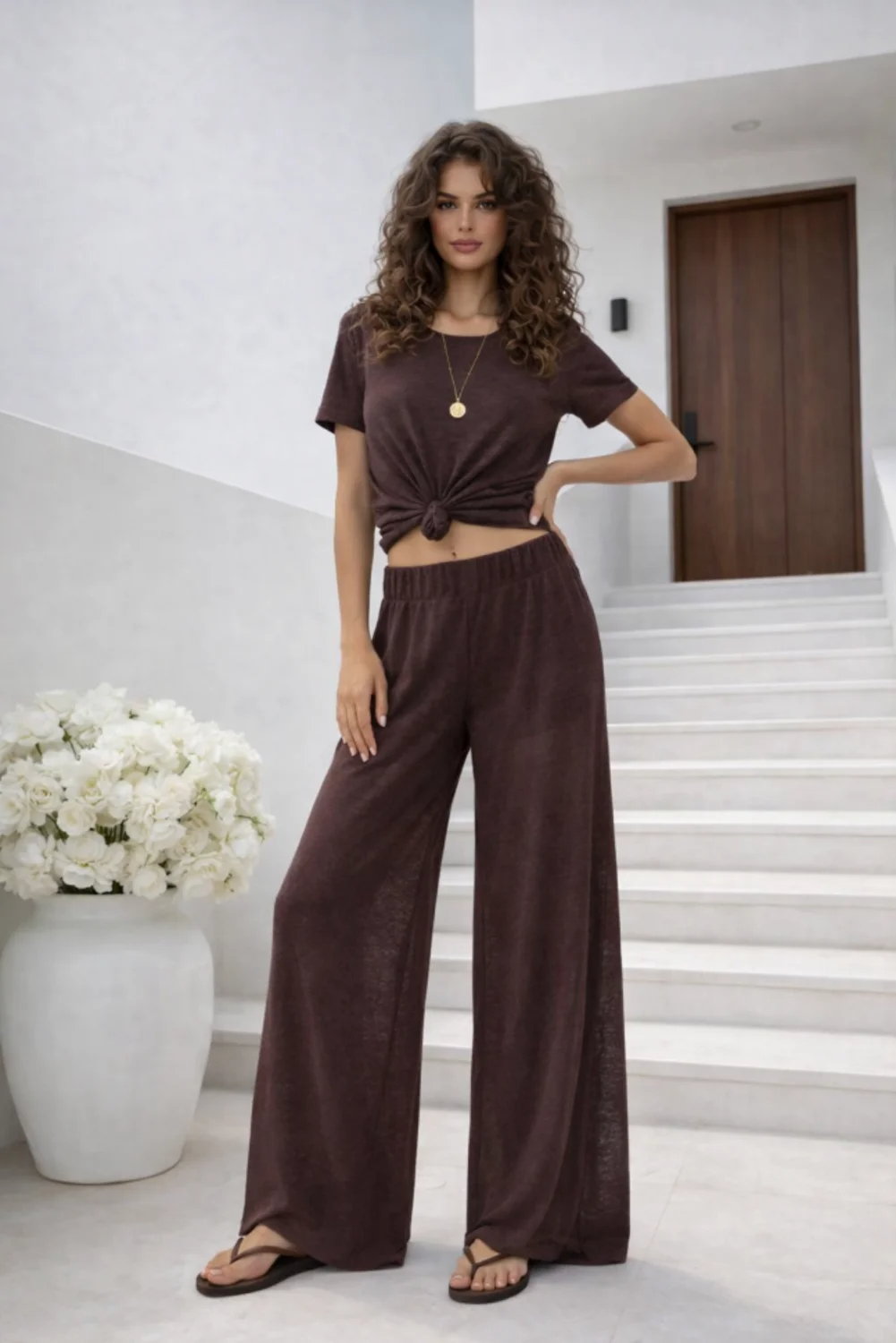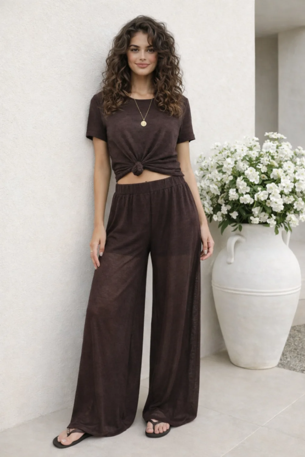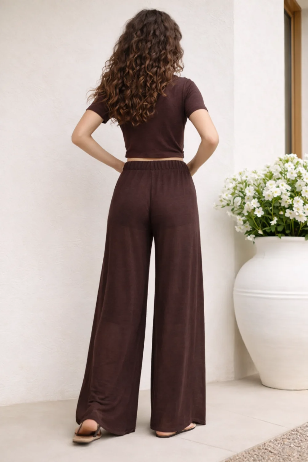 Широкие брюки из мягкой струящейся ткани с легкой полупрозрачностью — универсальная модель для повседневных и летних образов. Модель с высокой посадкой и широкой эластичной резинкой на талии обеспечивает комфортную посадку, а свободный крой красиво подчеркивает силуэт и добавляет легкости движению. Внутри предусмотрены вшитые шорты из основной ткани, что делает модель более практичной и удобной в носке. Низ брюк оставлен без обработки, создавая естественный, лаконичный край. Брюки отлично подойдут для летних прогулок, отдыха у моря, путешествий или городских образов в теплую погоду — их легко сочетать как с базовыми топами, так и с более акцентными вещами. Состав: вискоза 55%, полиэстер 45%.