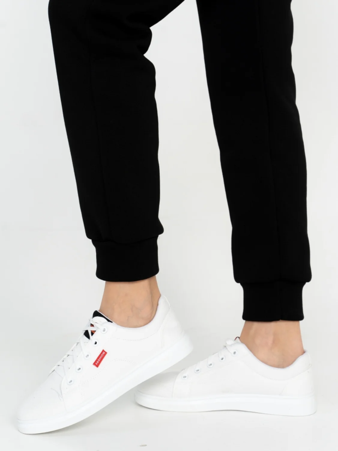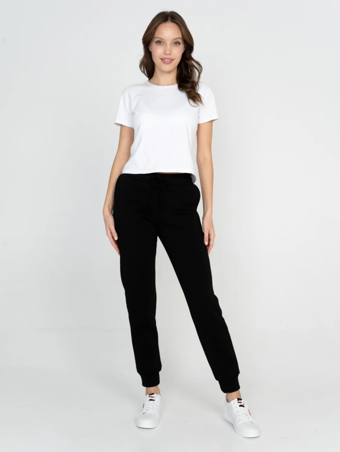 Женские спортивные брюки на манжетах. Узкие прямые штанины. Притачной пояс с регулировочным декоративным шнуром. Внутренние карманы в боковых швах усилены строчкой.