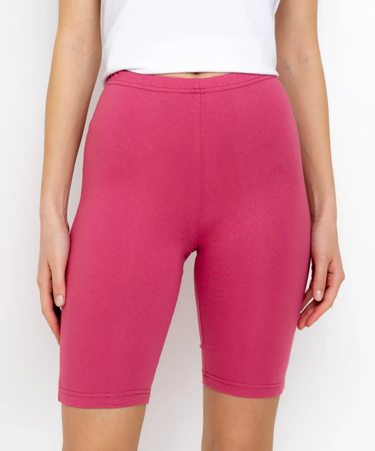 Велосипедки, длиной выше колена, пошиты из натурального хлопкового трикотажа с добавлением лайкры. Комфортны для выполнения физических упражнений. Полотно прекрасно тянется, но сохраняет свою форму даже при длительной носке, хорошо пропускает воздух и не допускает перегрева. Благодаря этим качествам, велосипедки, самых разных цветов, не выходят из моды и их смело можно назвать незаменимым элементом базового гардероба каждой женщины. Велосипедки составят достойную пару, как блузке спортивного стиля, так и фантазийной легкой рубашке. Уместны такие комплекты не только дома и в спортивном зале, но и во время прогулки в парке или поездке на поезде, где иногда приходится демонстрировать чудеса эквилибристики.