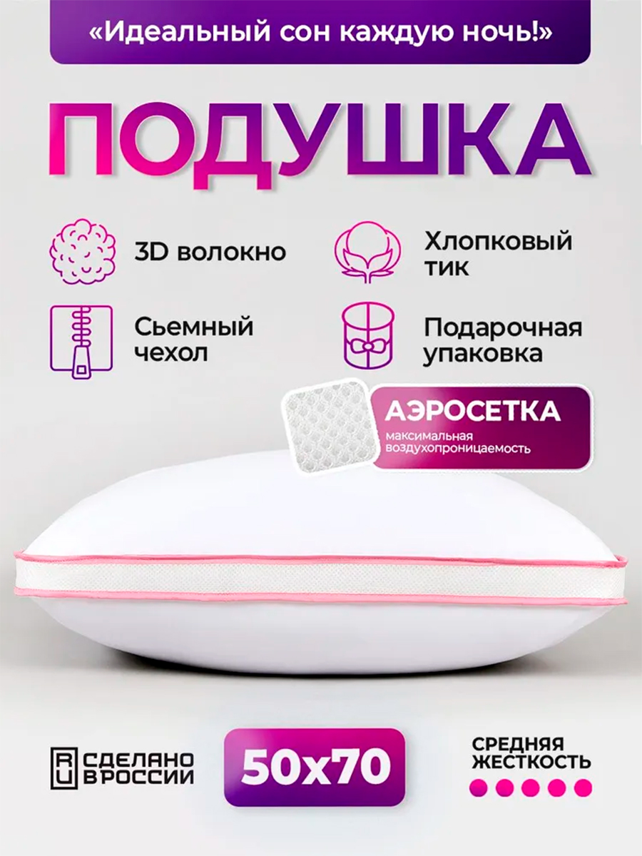 Модель: Подушка для сна 50х70 с аэросеткой, средняя жесткость, анатомическая, наполнитель 3D волокно, гипоаллергенная, съемный чехол из хлопка