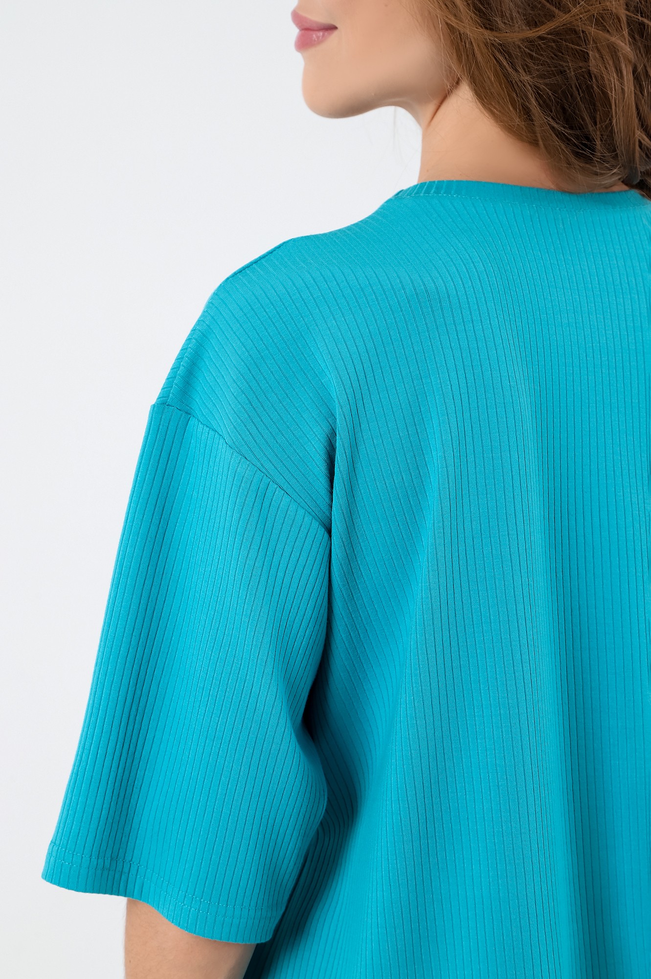 Костюм женский из гладкокрашенного трикотажного полотна в рубчик («лапша»), состоящий из футболки и леггинсов. Футболка – удлиненная, свободного покроя, со спущенной, линией плеча, короткими втачными рукавами, горловиной овальной формы, обработанной втачной планкой.Леггинсы – длиной до колен, с эластичной тесьмой по талии.