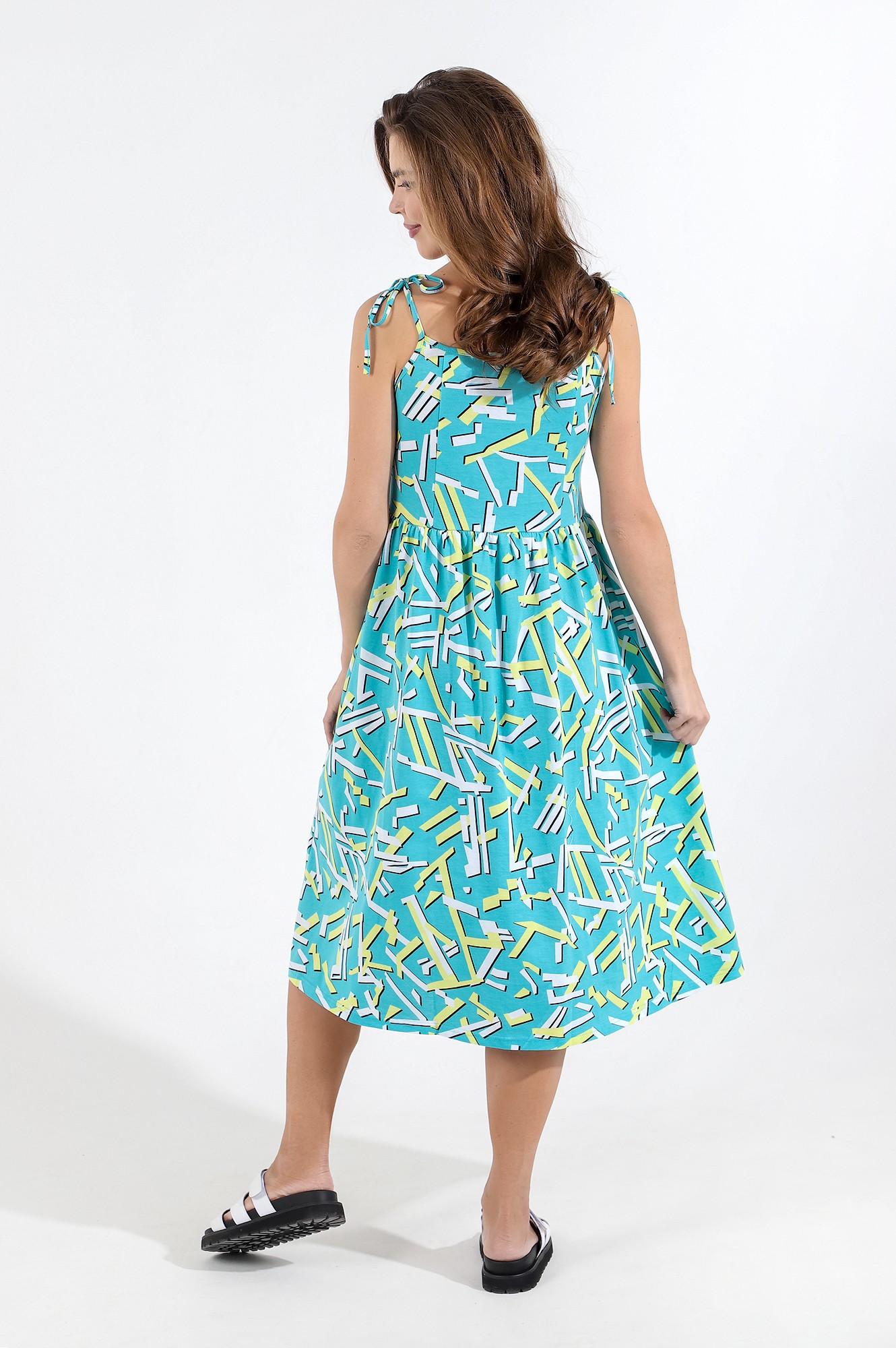 Сарафан молодежный из трикотажного полотна «кулирка» с набивным рисунком, отрезное по линии талии, без рукавов на завязывающихся бретелях, с центральной бортовой застежкой на обметанные петли и пуговицы. Верхний срез переда обработан обтачками, спинки - окантован основным материалом. На верхней части полочки и спинки выполнены рельефы, нижняя часть присборена по шву стачивания с верхней.