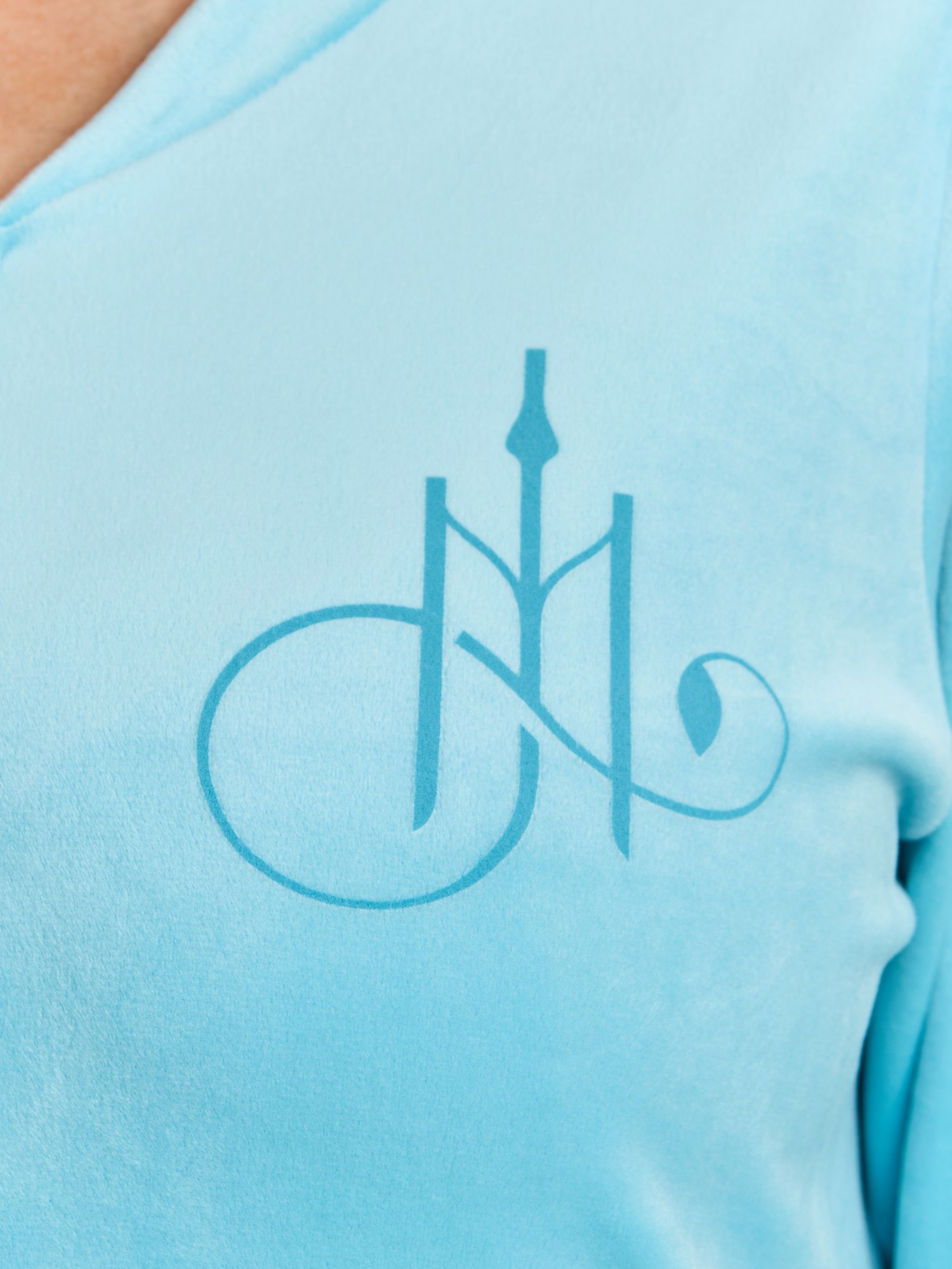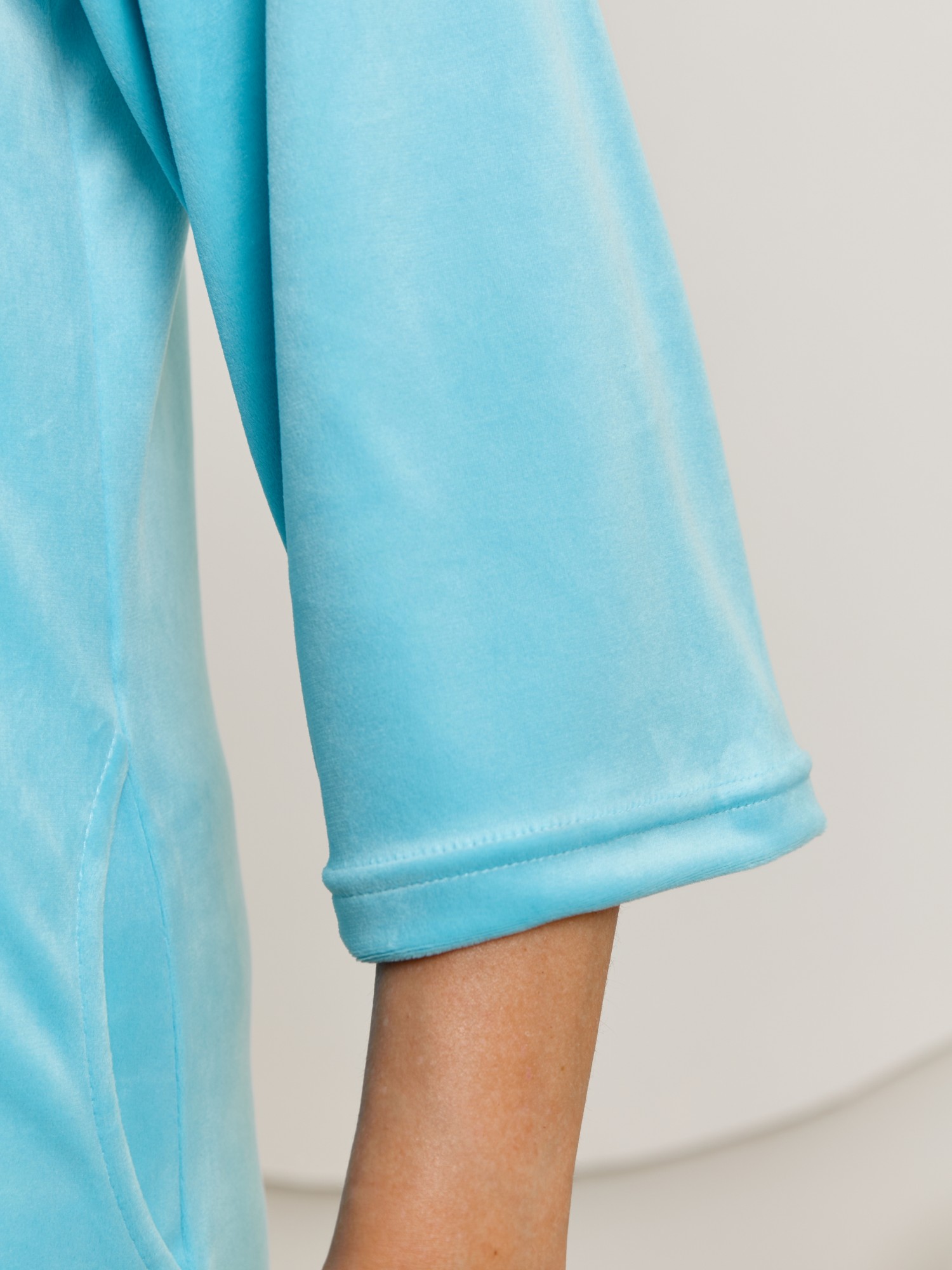 Халат женский из гладкокрашенного трикотажного полотна «велюр стрейч», прямого силуэта, с втачными рукавами длиной ¾ и карманами в боковых швах. Горловина v-образной формы обработана втачной планкой, переходящей в центральную бортовую застежку на тесьму «молния», на левой полочке печать, выполненная в технике «шелкографии».