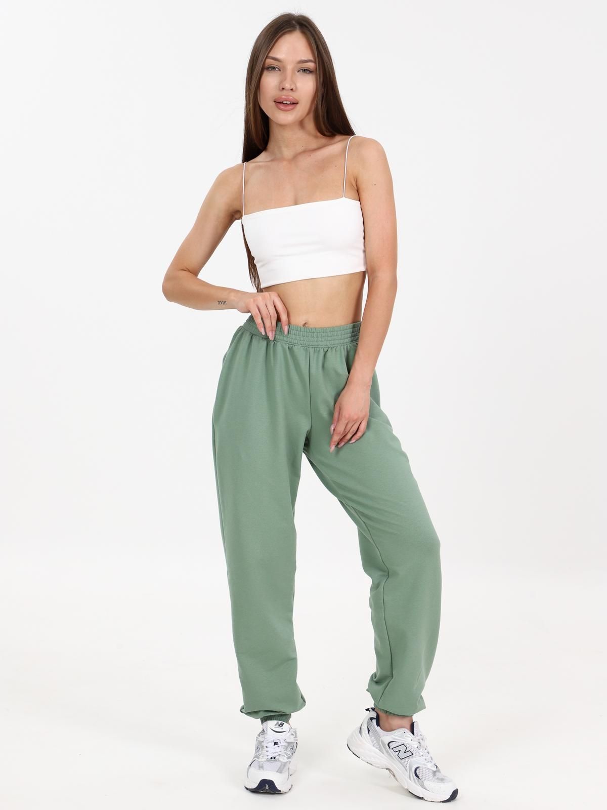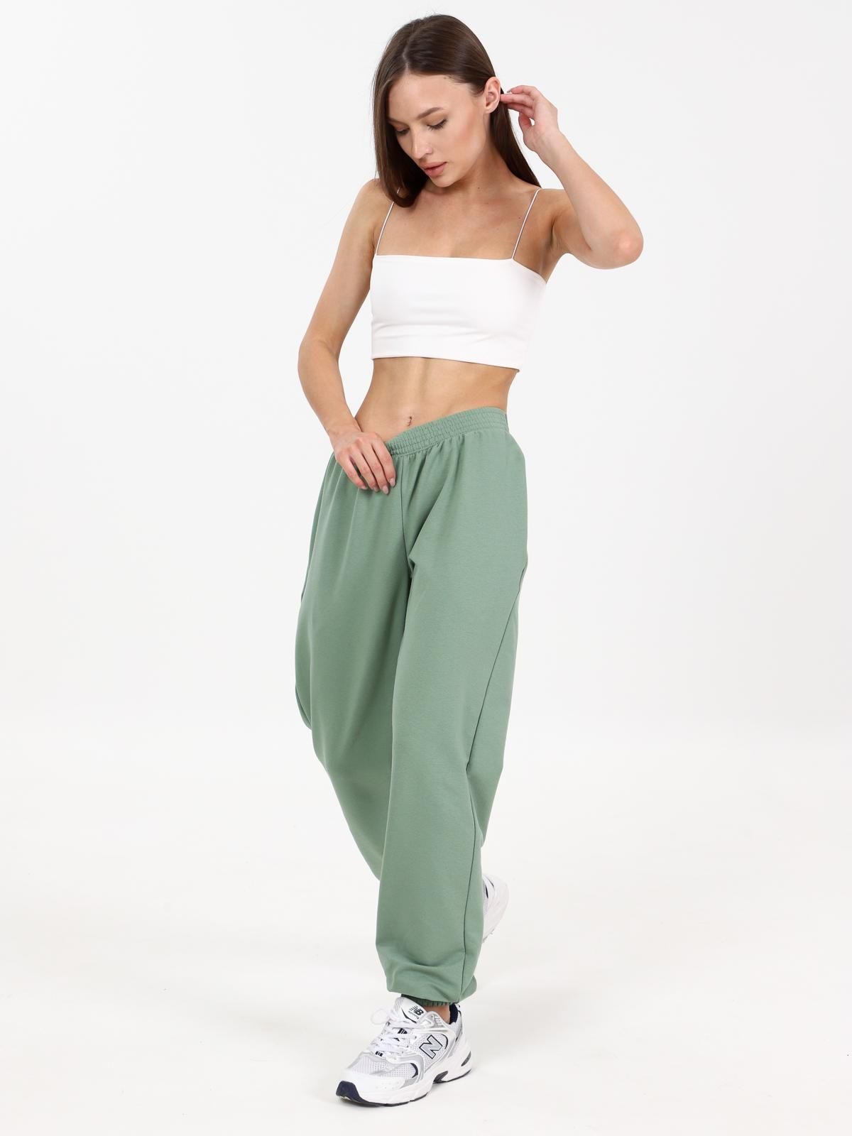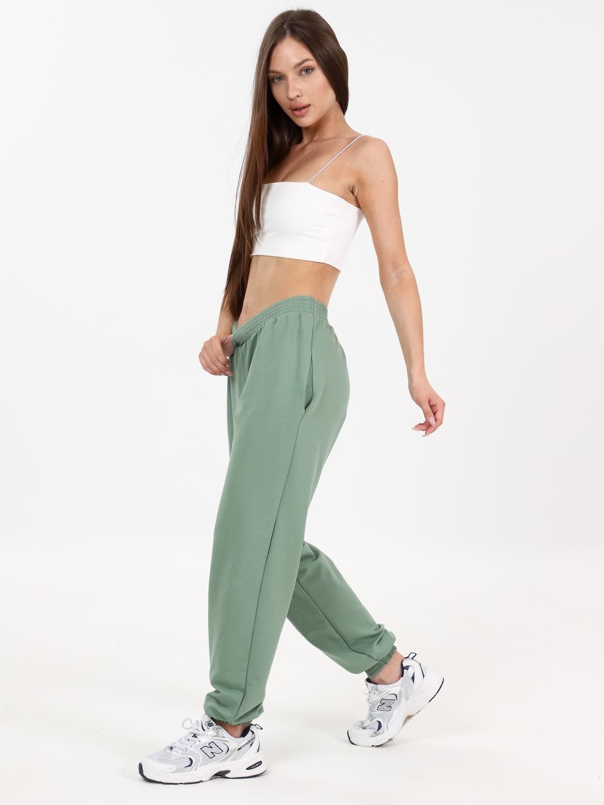 Брюки свободного покроя в стиле "over size" с карманами в боковых швах. Верх брюк с эластичной тесьмой, низ с манжетами. Пояс и манжеты прострочены на поясной машине.