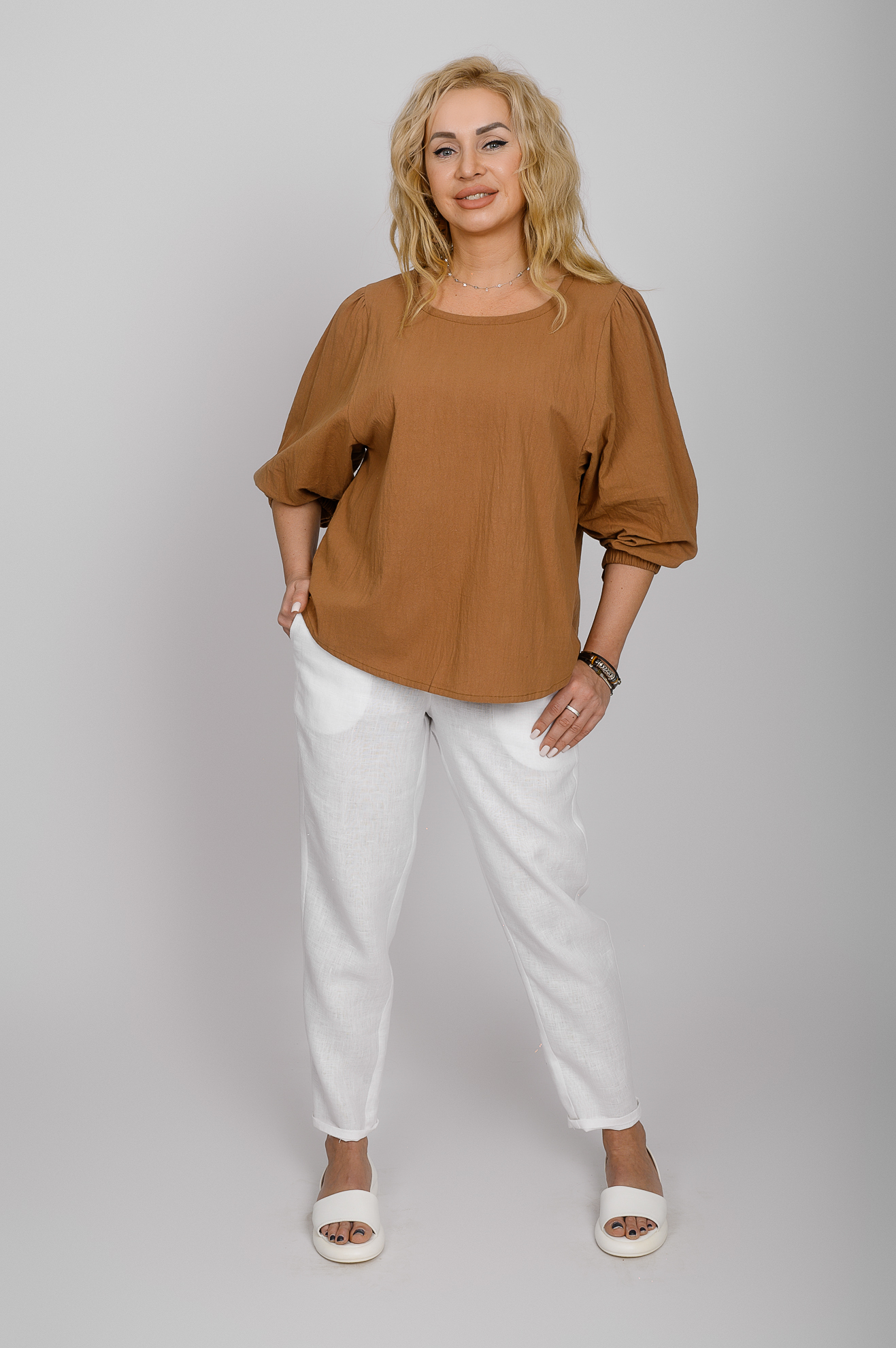 Блузка из легкой ткани для жаркого дня. Жатая фактура красиво смотрится и значительно облегчает уход за изделием. Углубленная пройма, пышный рукав на резинке. Низ изделия плавно закруглен.