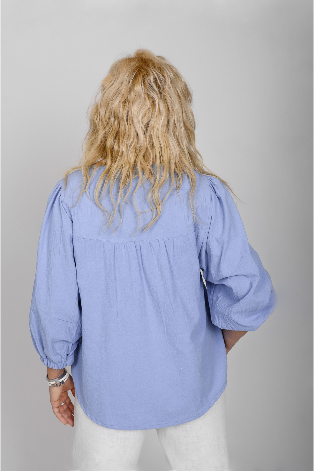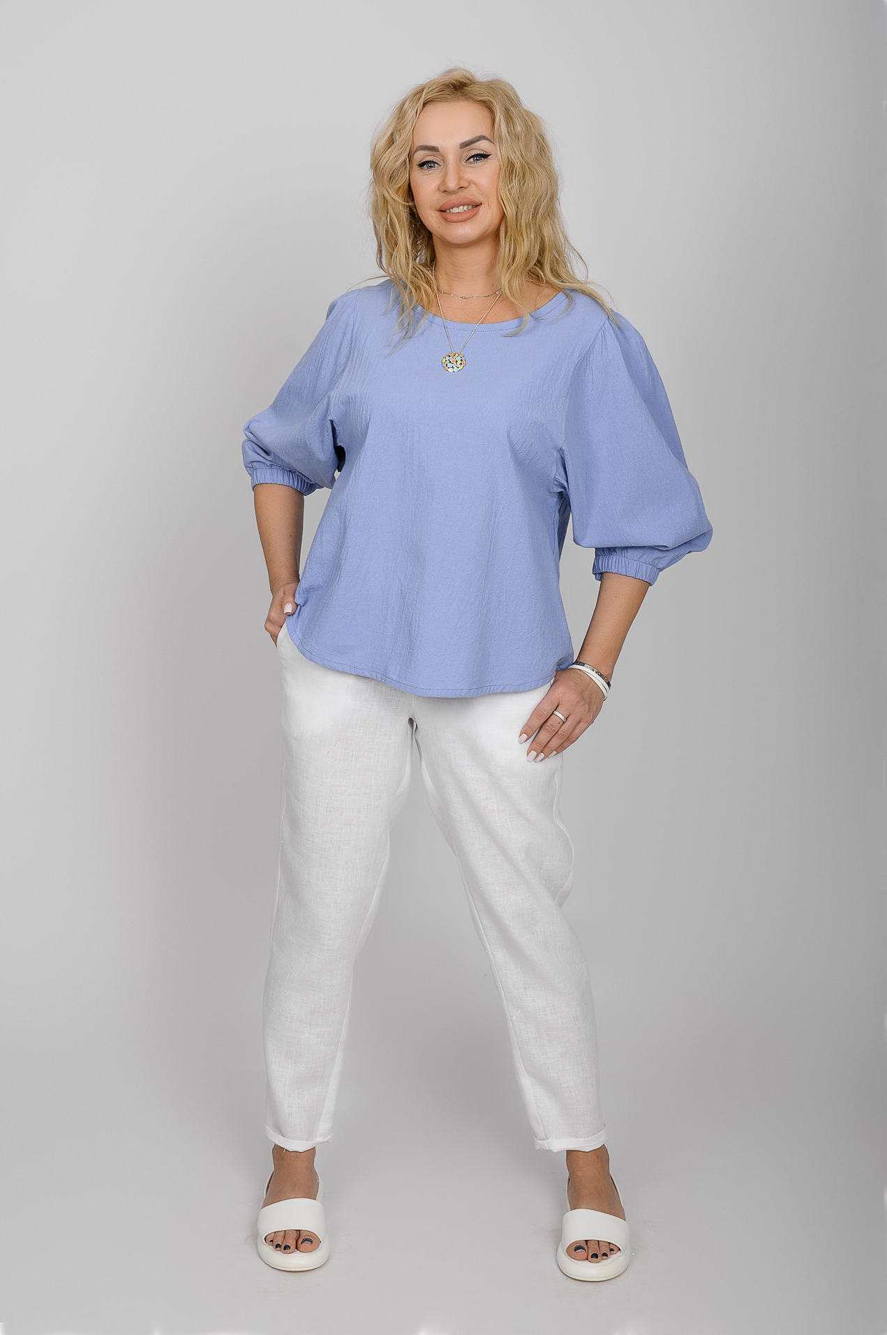 Блузка из легкой ткани для жаркого дня. Жатая фактура красиво смотрится и значительно облегчает уход за изделием. Углубленная пройма, пышный рукав на резинке. Низ изделия плавно закруглен.