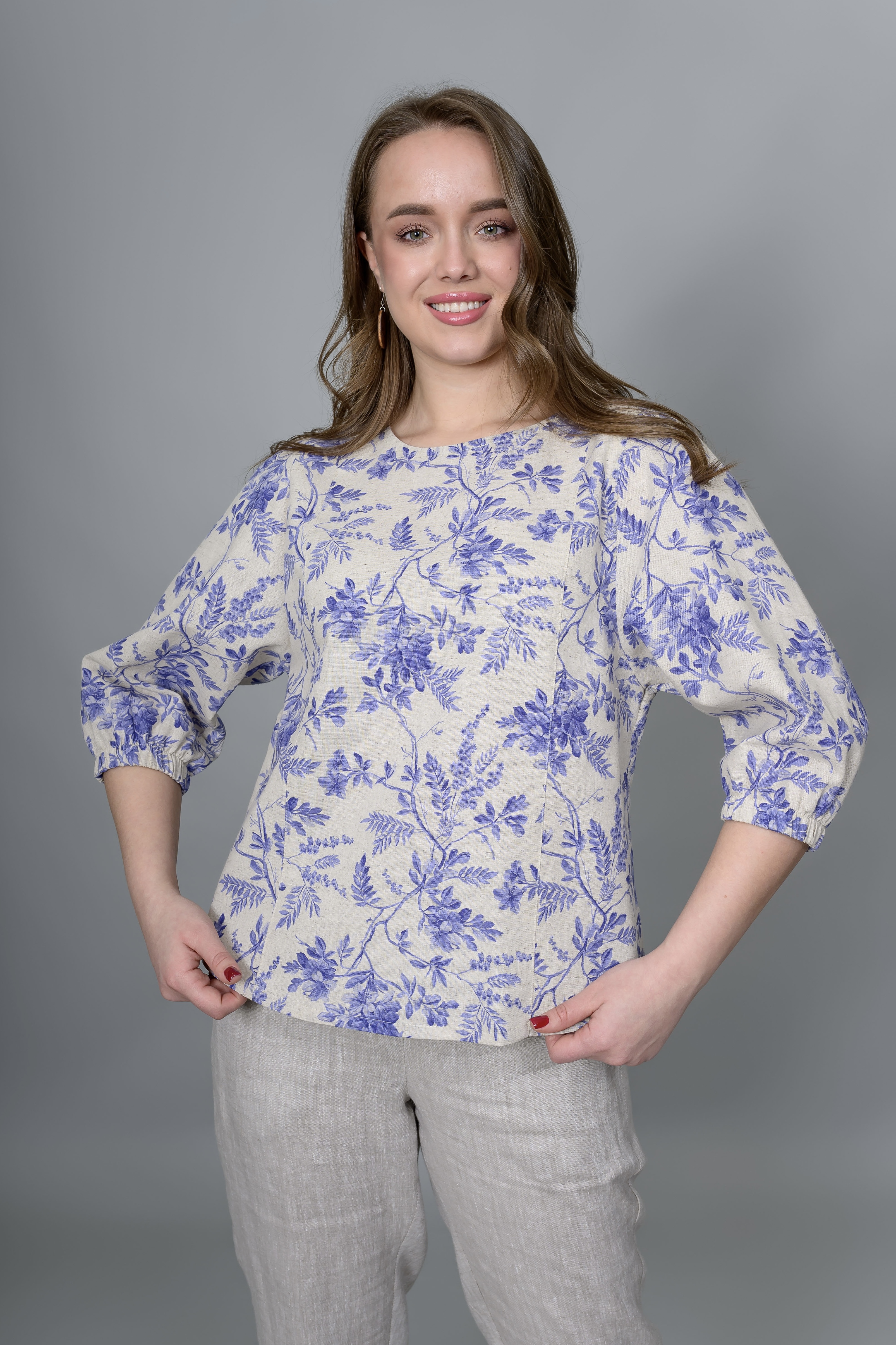 Свободная блузка из натуральной ткани с круглым вырезом  горловины и продольными рельефами спереди, обеспечивающими отличную посадку изделия. Углубленная пройма и пышный рукав собранный  внизу на резинку не сковывают движение, благодаря чему даже в самый жаркий день, можно будет чувствовать себя свежо и комфортно. Низ изделия плавно закруглен.